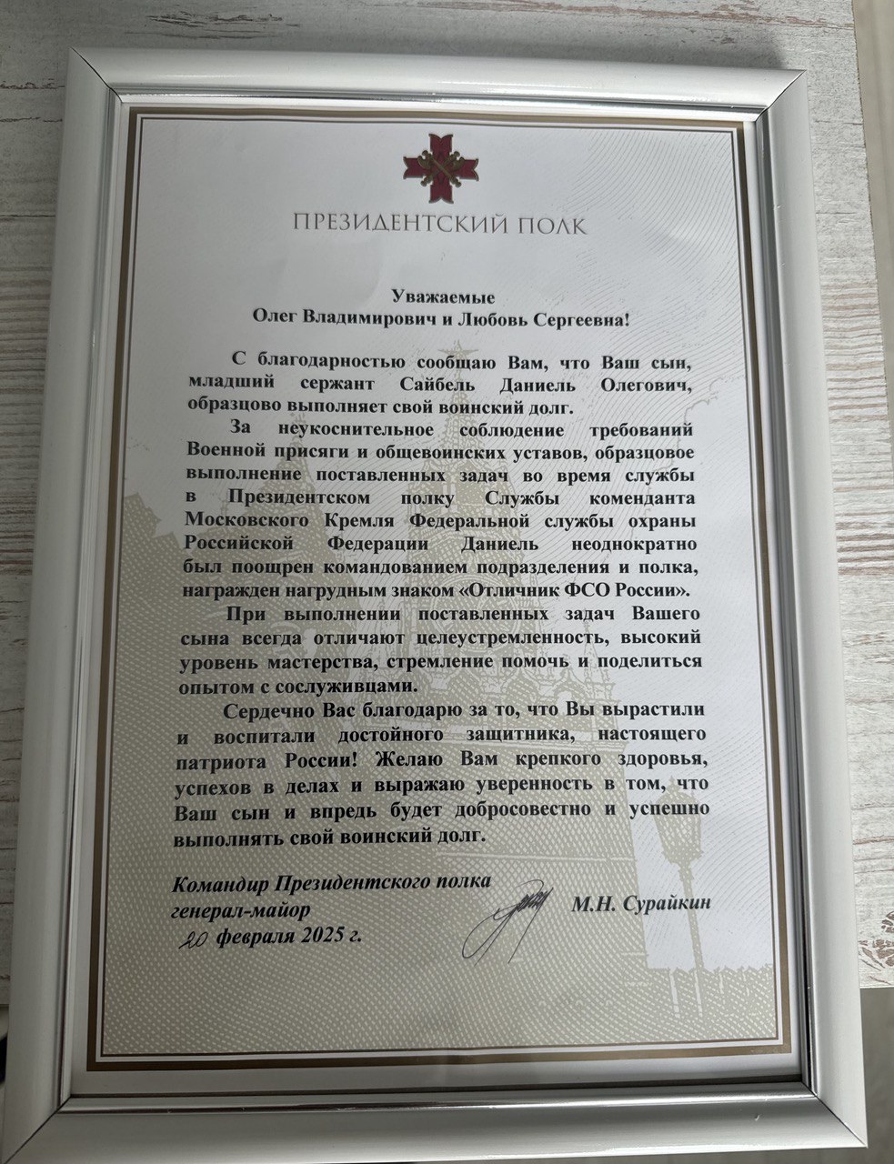Даниель Сайбель проходил службу в элитном Президентском полку, который обеспечивает безопасность первых лиц государства и участвует в официальных церемониях. За время службы молодой человек неоднократно поощрялся командованием, а также был удостоен нагрудного знака «Отличник ФСО России» – одной из самых почётных ведомственных наград.