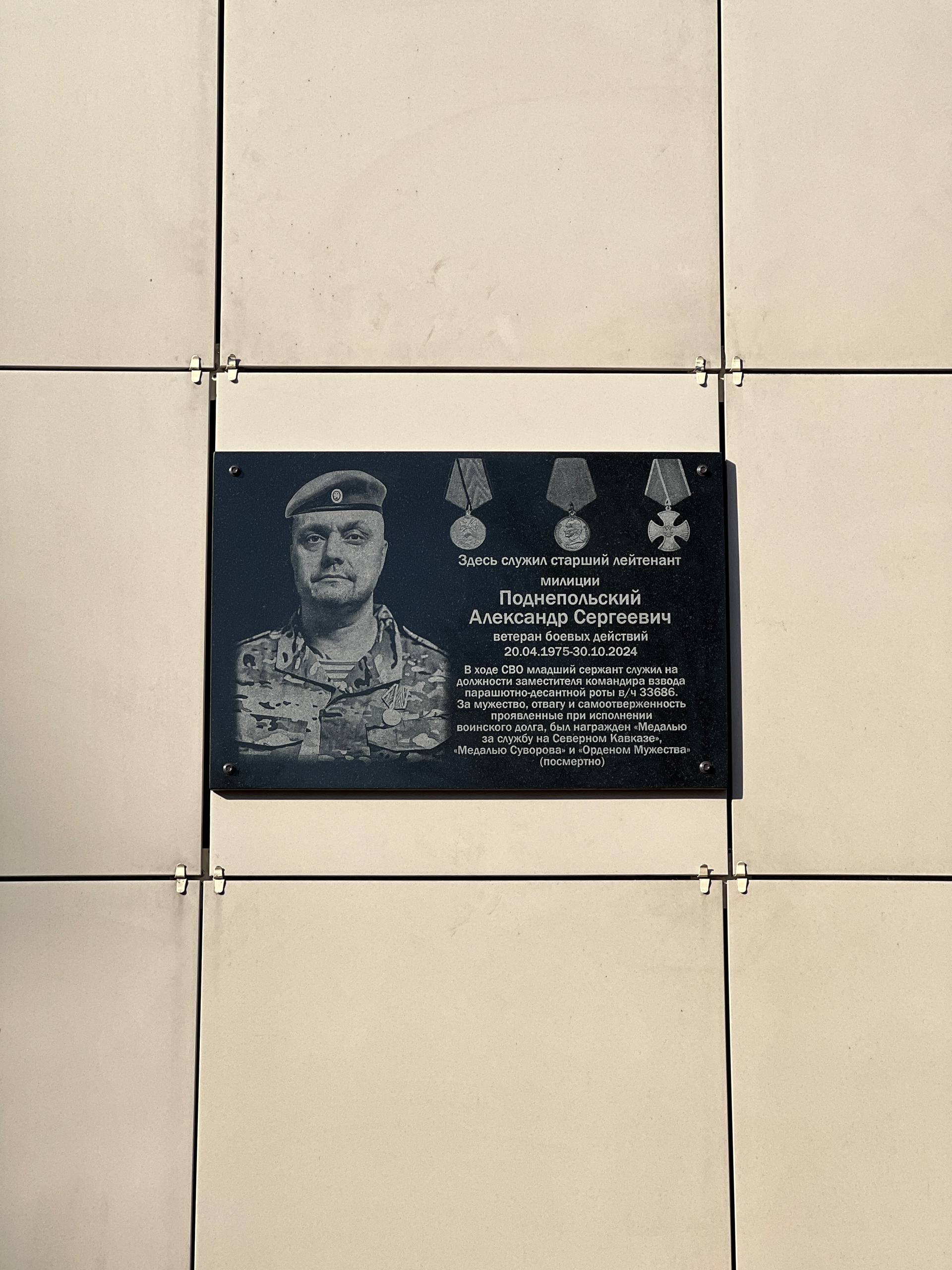 Сегодня, 30 октября, на фасаде здания линейного отдела полиции на станции Рубцовск состоялась торжественная церемония открытия мемориальной доски бывшему сотруднику Алтайского линейного управления МВД России Александру Сергеевичу Поднепольскому, погибшему при исполнении воинского долга в ходе проведения специальной военной операции.