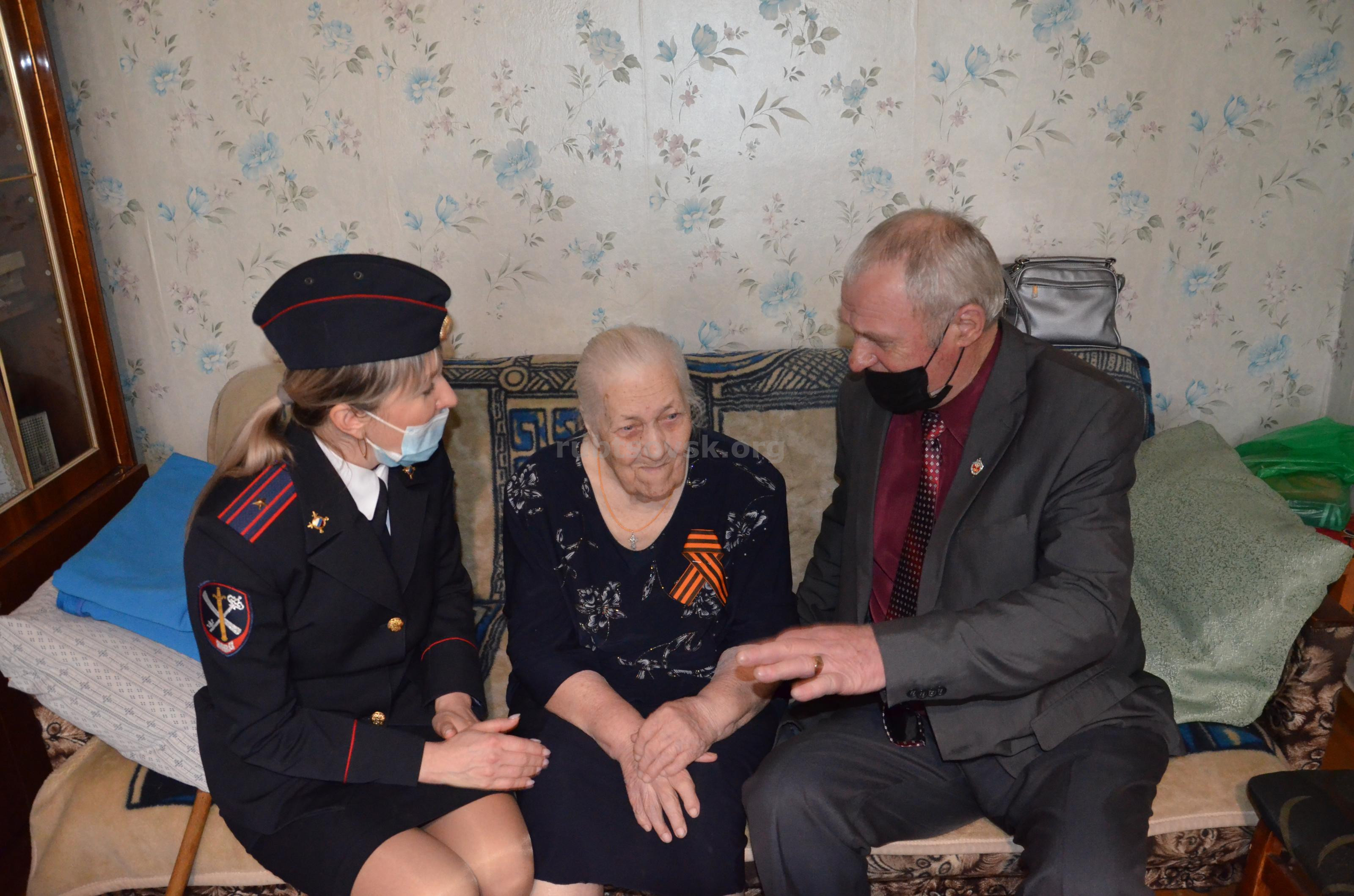 В честь праздника уважаемой труженице тыла сотрудники полиции вручили поздравительные открытки, цветы и продуктовый набор.