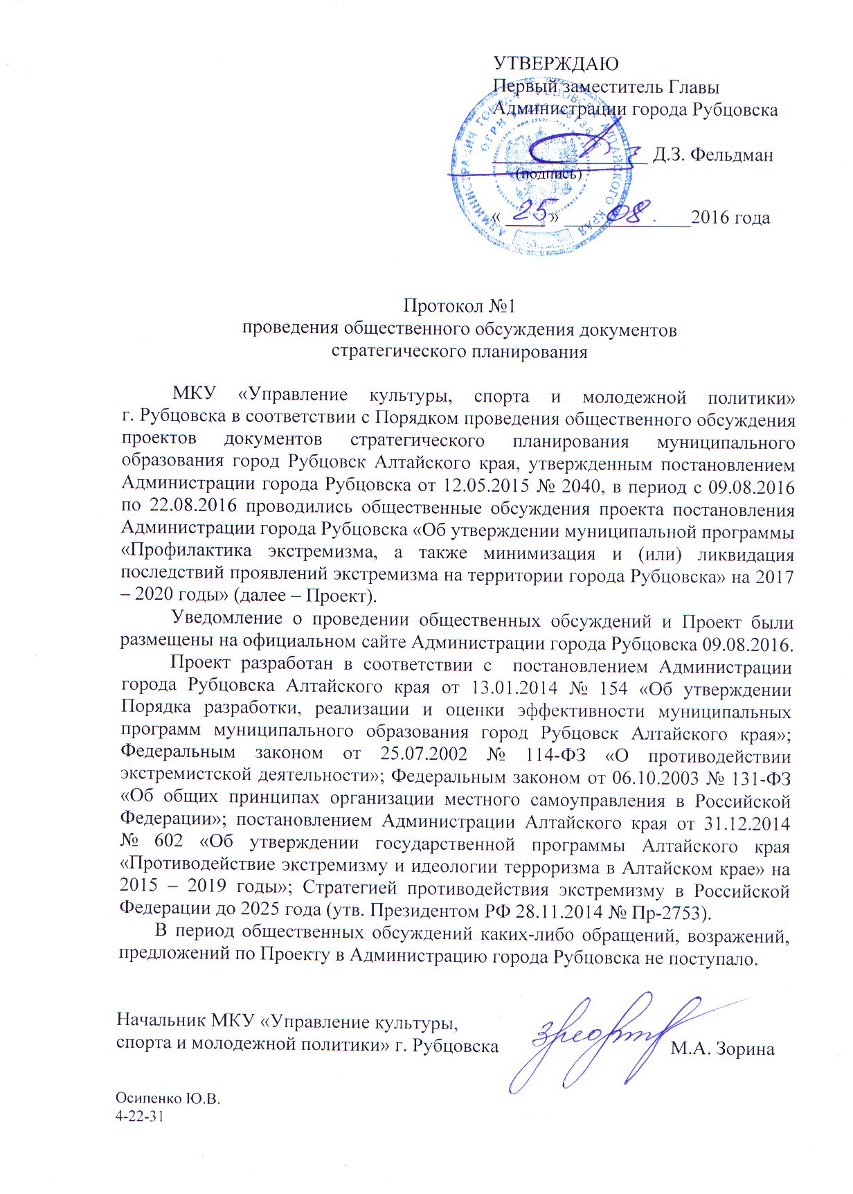 Предложения и замечания направлять заместителю начальника МКУ "Управление культуры, спорта и молодежной политики" г. Рубцовска - Осипенко Юлия Владиславовна,