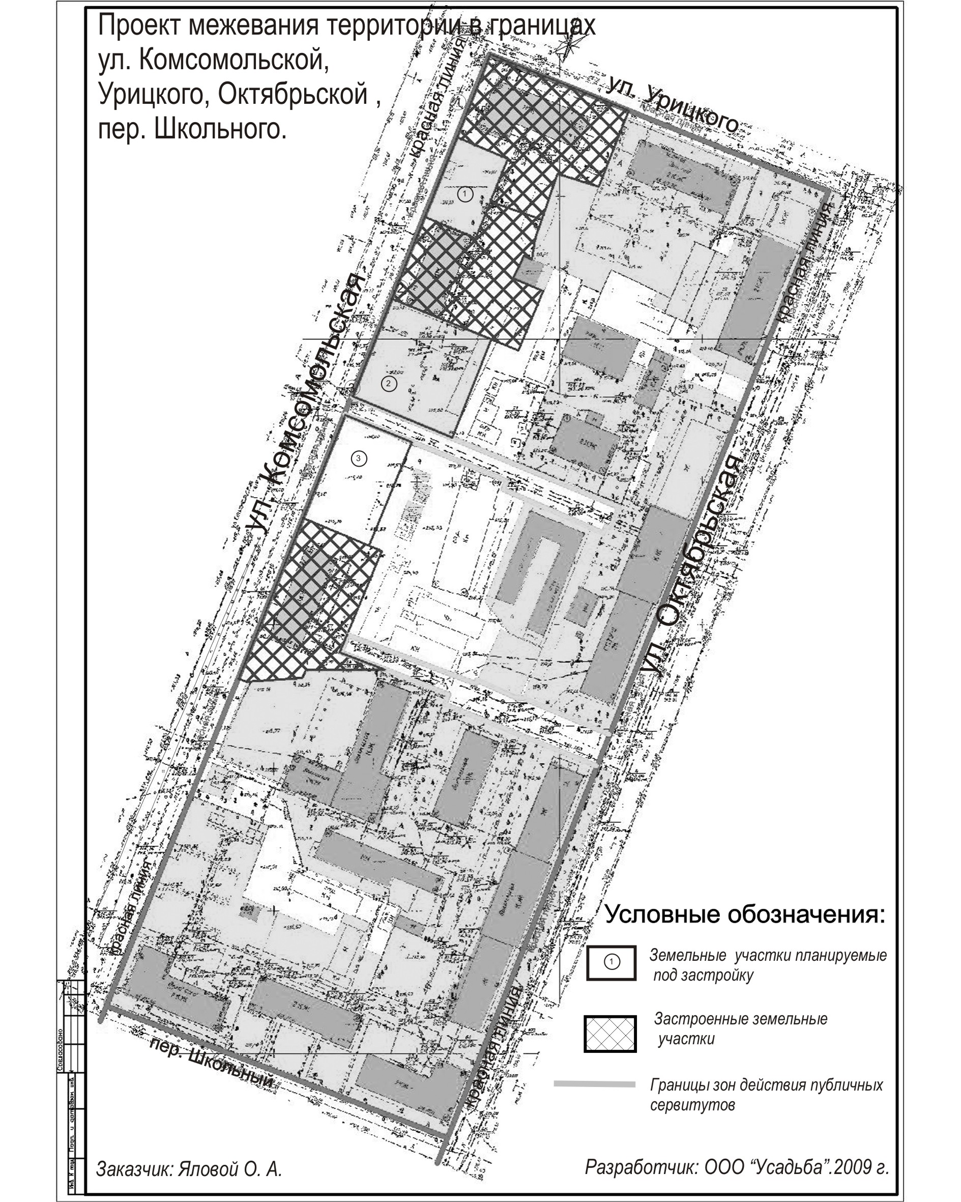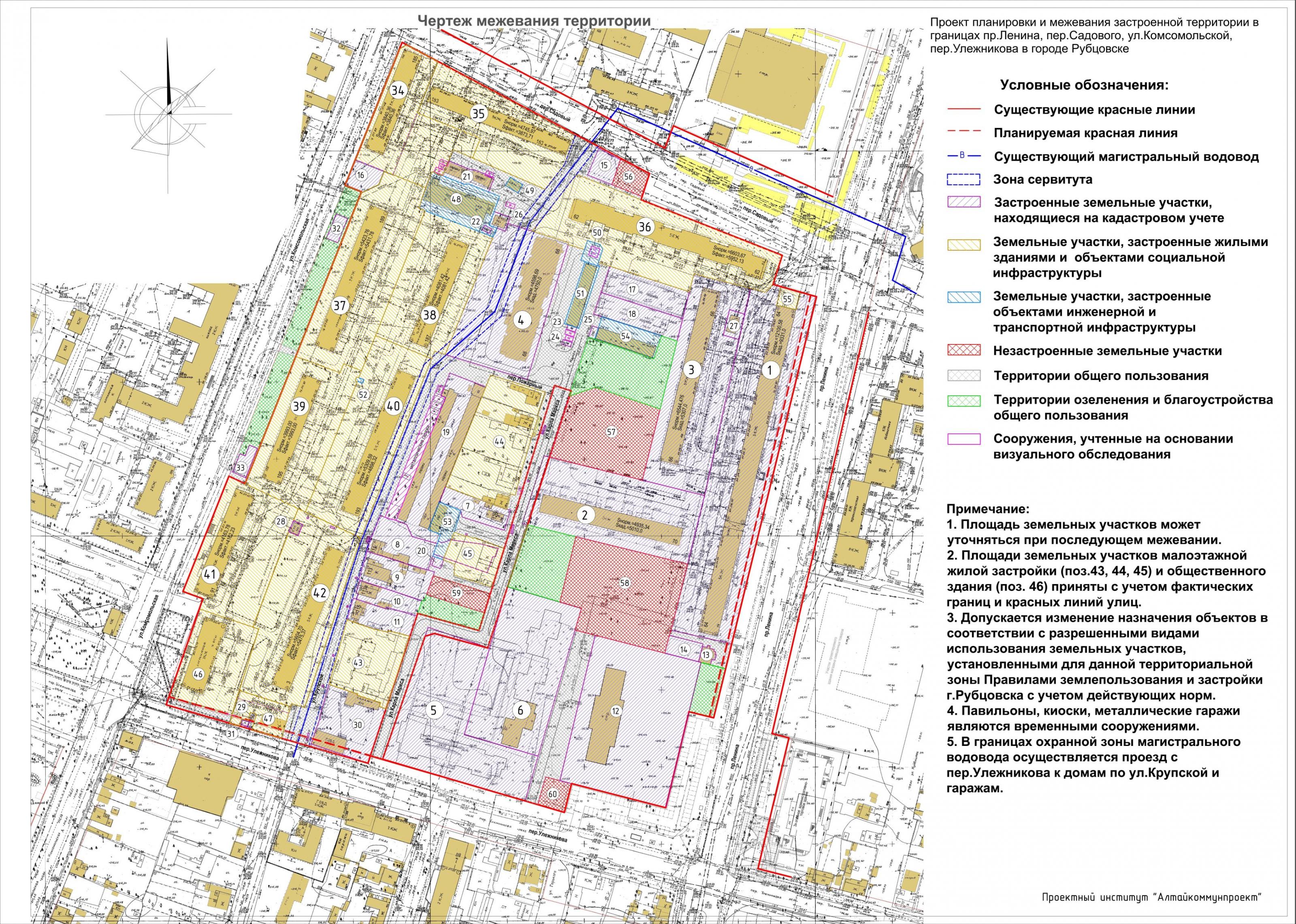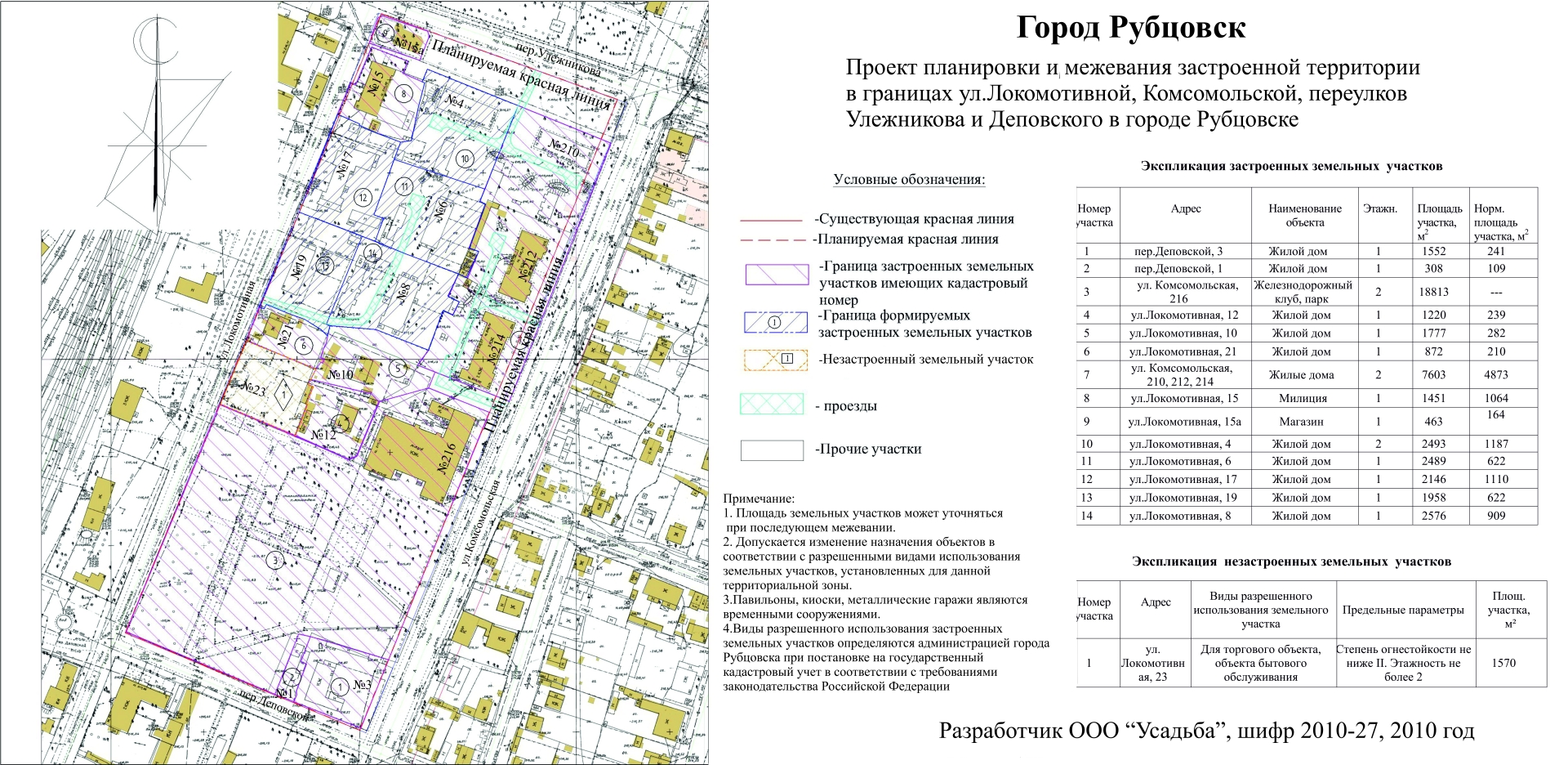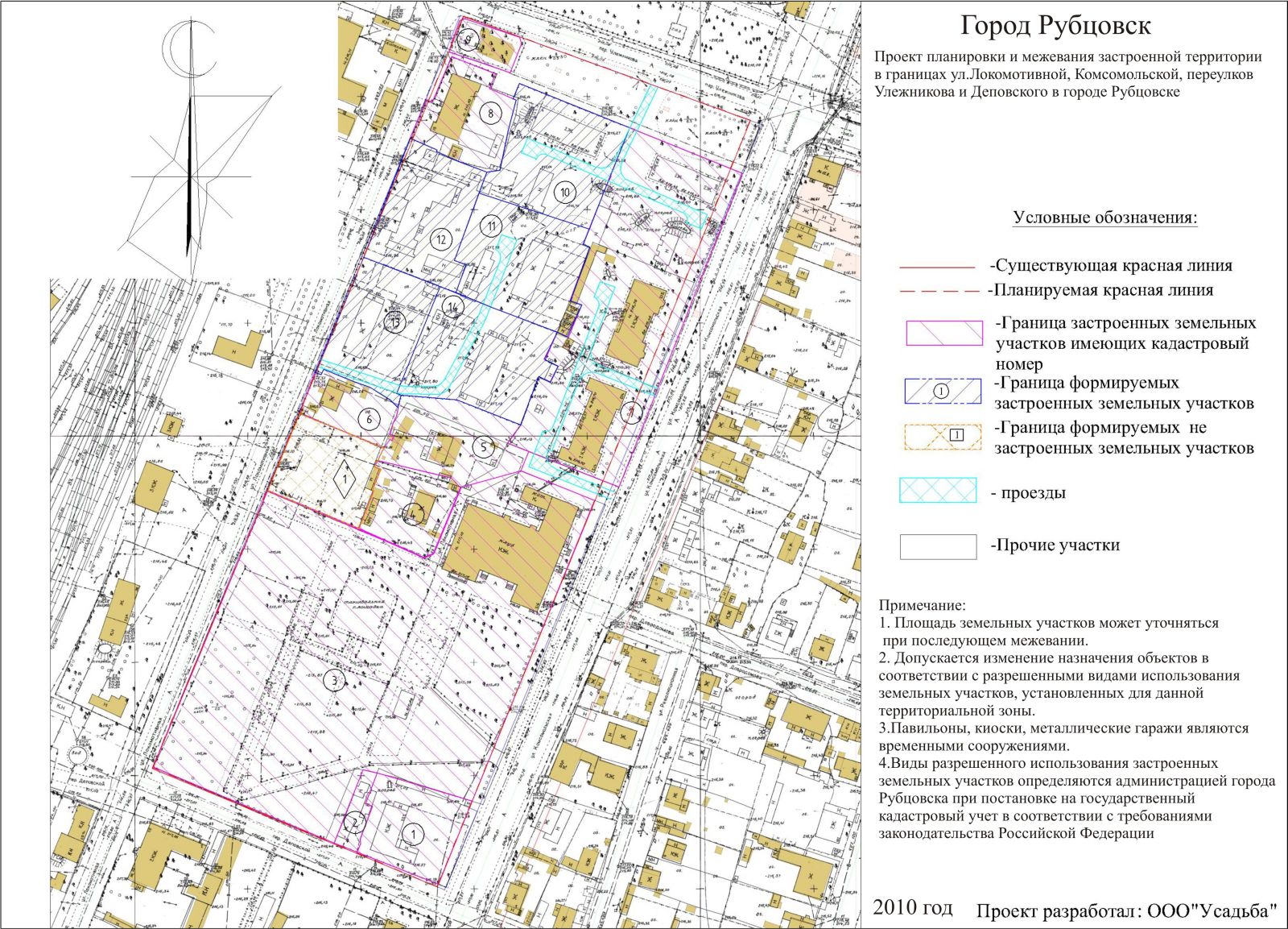 Согласно постановлению администрации города от 25.02.2010 № 689 решено подготовить проект планировки и межевания застроенной территории в границах пр. Ленина, пер. Садового, ул. Комсомольской, пер. Улежникова.