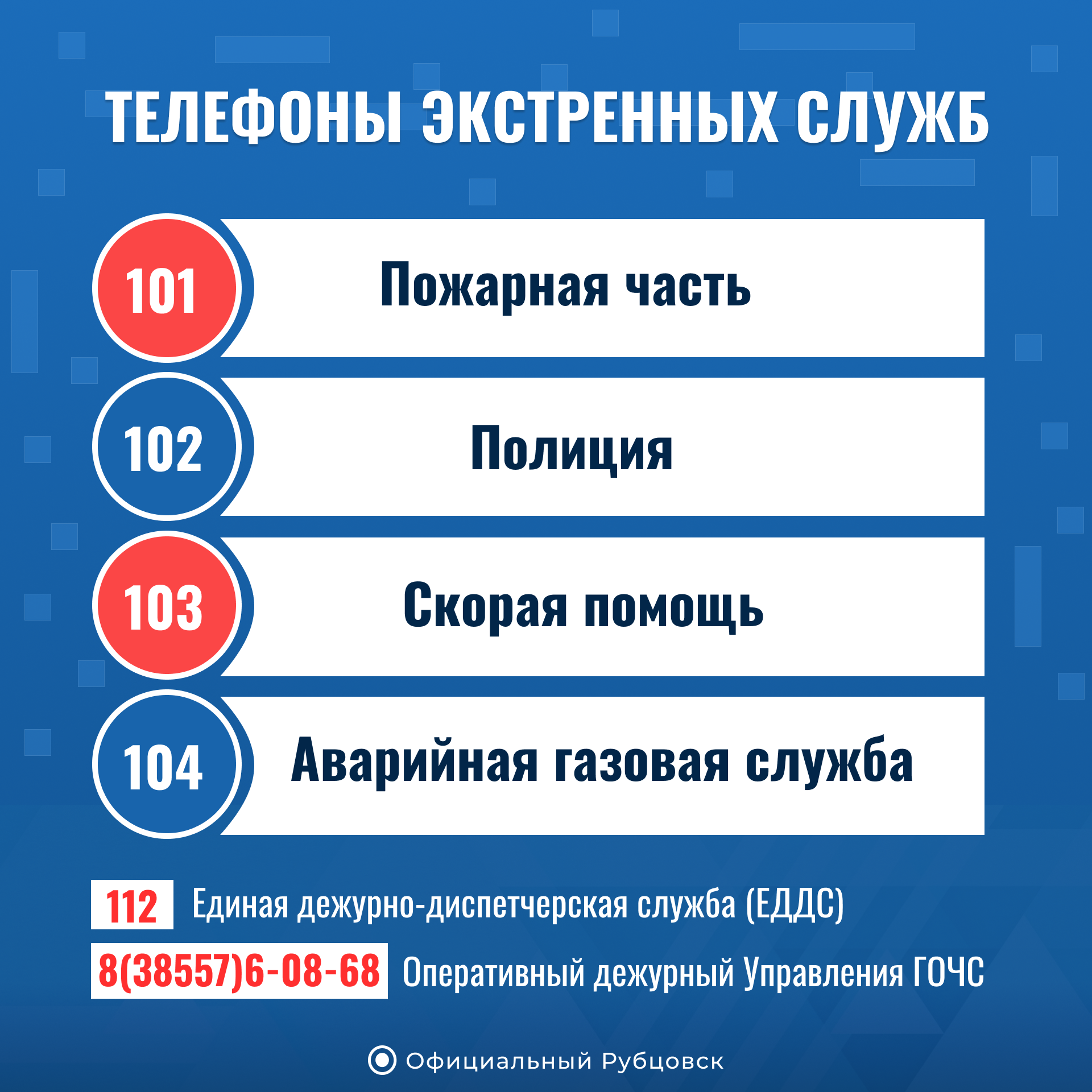 - Единая дежурно-диспетчерская служба (ЕДДС): 112