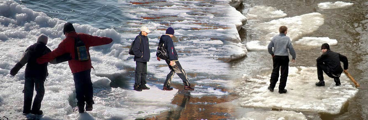 С наступлением весны под воздействием солнечных лучей лед быстро подтаивает. Еще более разрушительные действия на него оказывает усиливающееся весной течение воды в реках, которое подтачивает его снизу. С каждым днем он становится все более пористым, рыхлым и слабым. Вполне понятно, что передвижение по такому льду связано с большой опасностью. Нужно знать, что весенний лед резко отличается от осеннего и зимнего. Если осенний лед под тяжестью человека начинает трещать, предупреждая об опасности, то весенний лед не трещит, а проваливается, превращаясь в ледяную кашицу.