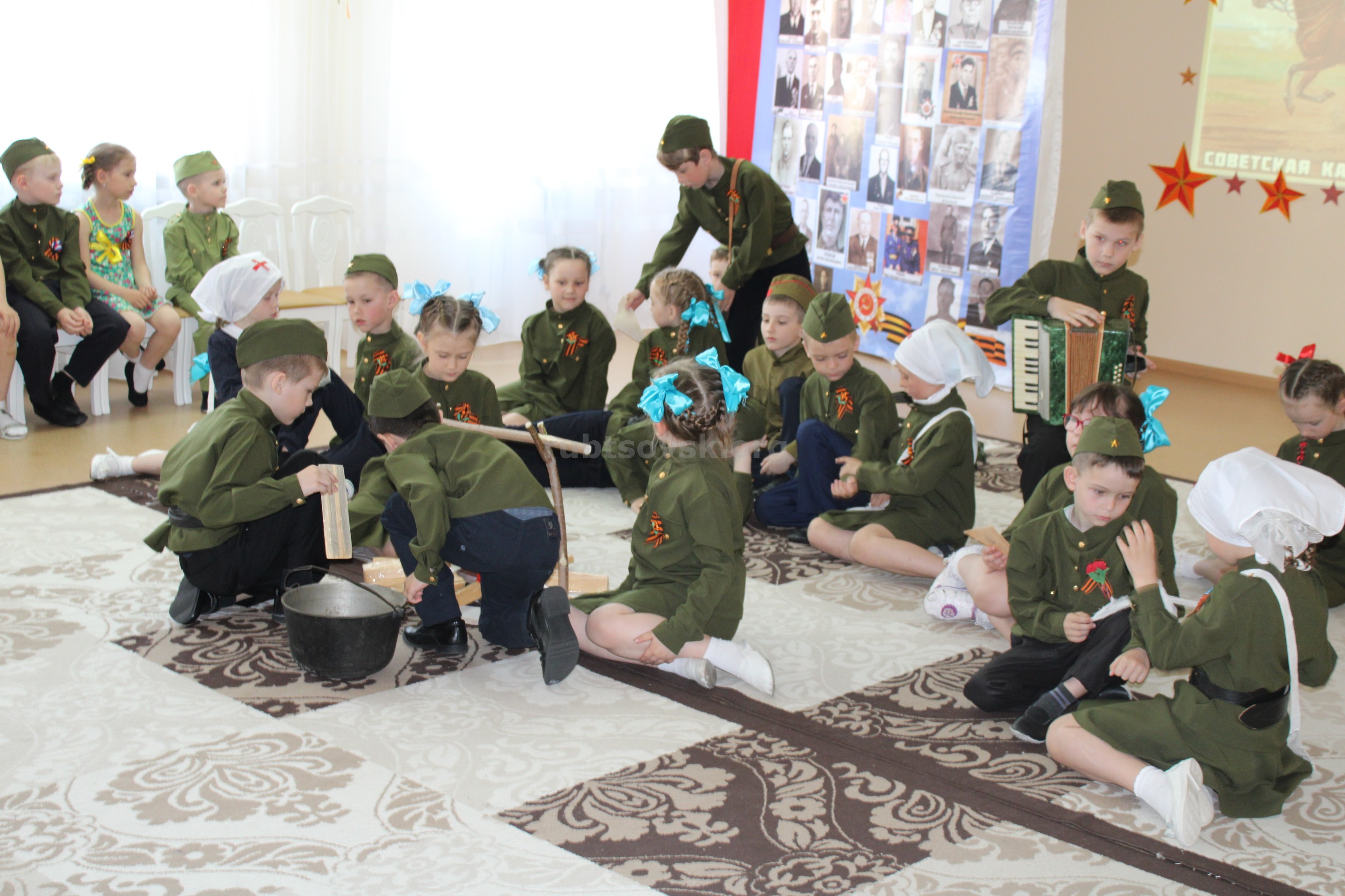 Представление в честь Дня Победы с участием детей получилось искренним и трогательным, некоторые зрители не могли сдержать слезы, глядя на выступления серьезных малышей в военной форме, слушая стихи и песни в их исполнении.