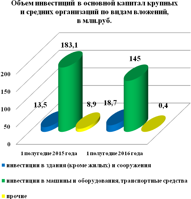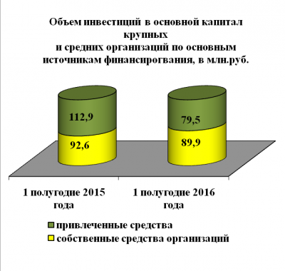 Инвестиции в основной капитал по крупным и средним организациям за 1 полугодие 2016 года составили 169,4 млн. руб. или на 36,1 млн.руб. меньше 1 полугодия прошлого года.