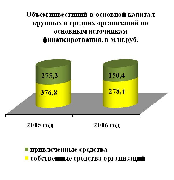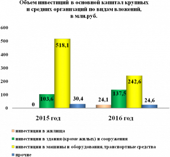 Инвестиции в основной капитал по крупным и средним организациям за 12 месяцев 2016 года составили 428,8 млн. руб. или на 223,3 млн. руб. меньше, чем за прошлый год.