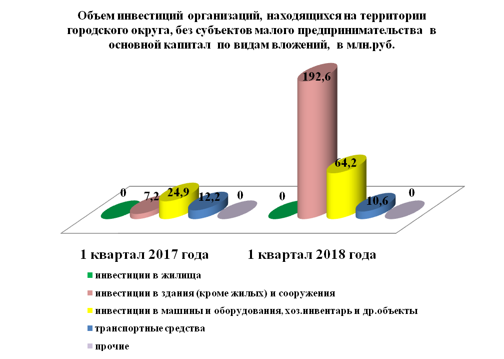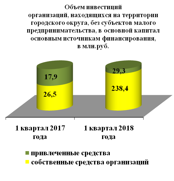 Инвестиции в основной капитал по организациям, находящимся на территории городского округа без субъектов малого предпринимательства, за 1 квартал 2018 года составили 267,7 млн. руб. или в 6 раза больше, чем в прошлом году.