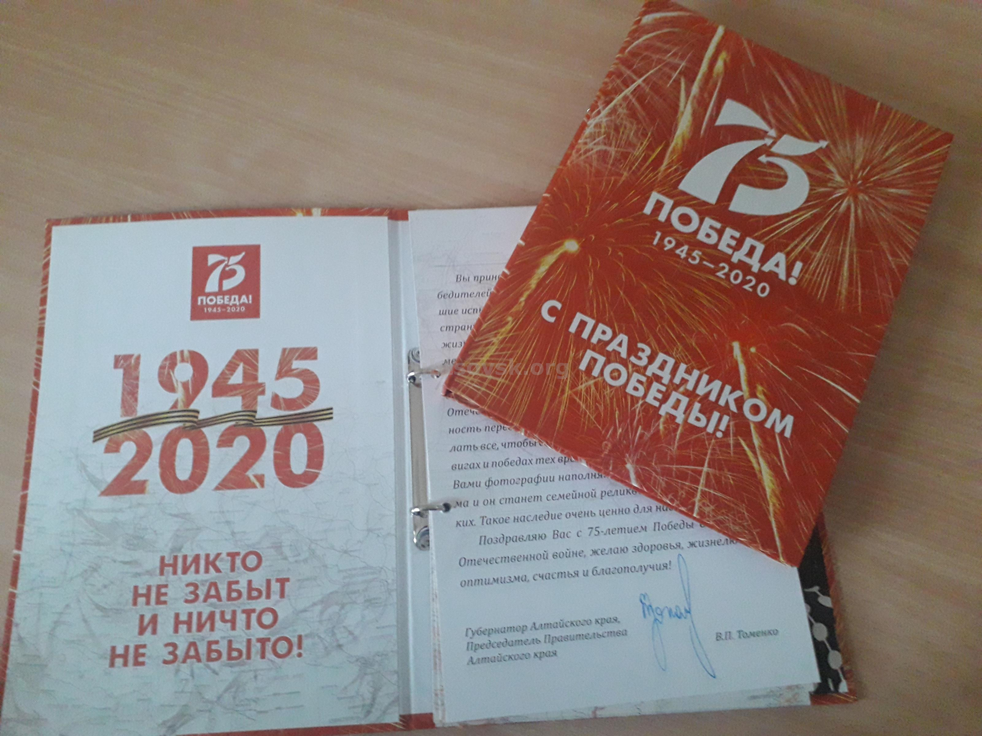 В каждом из альбомов будут размещены фотографии ветерана, а также история его жизни и участия в войне. Эти альбомы станут семейными реликвиями участников войны, которыми будут гордиться их дети и внуки. Там же содержится личное поздравление от губернатора Алтайского края Виктора Томенко.
