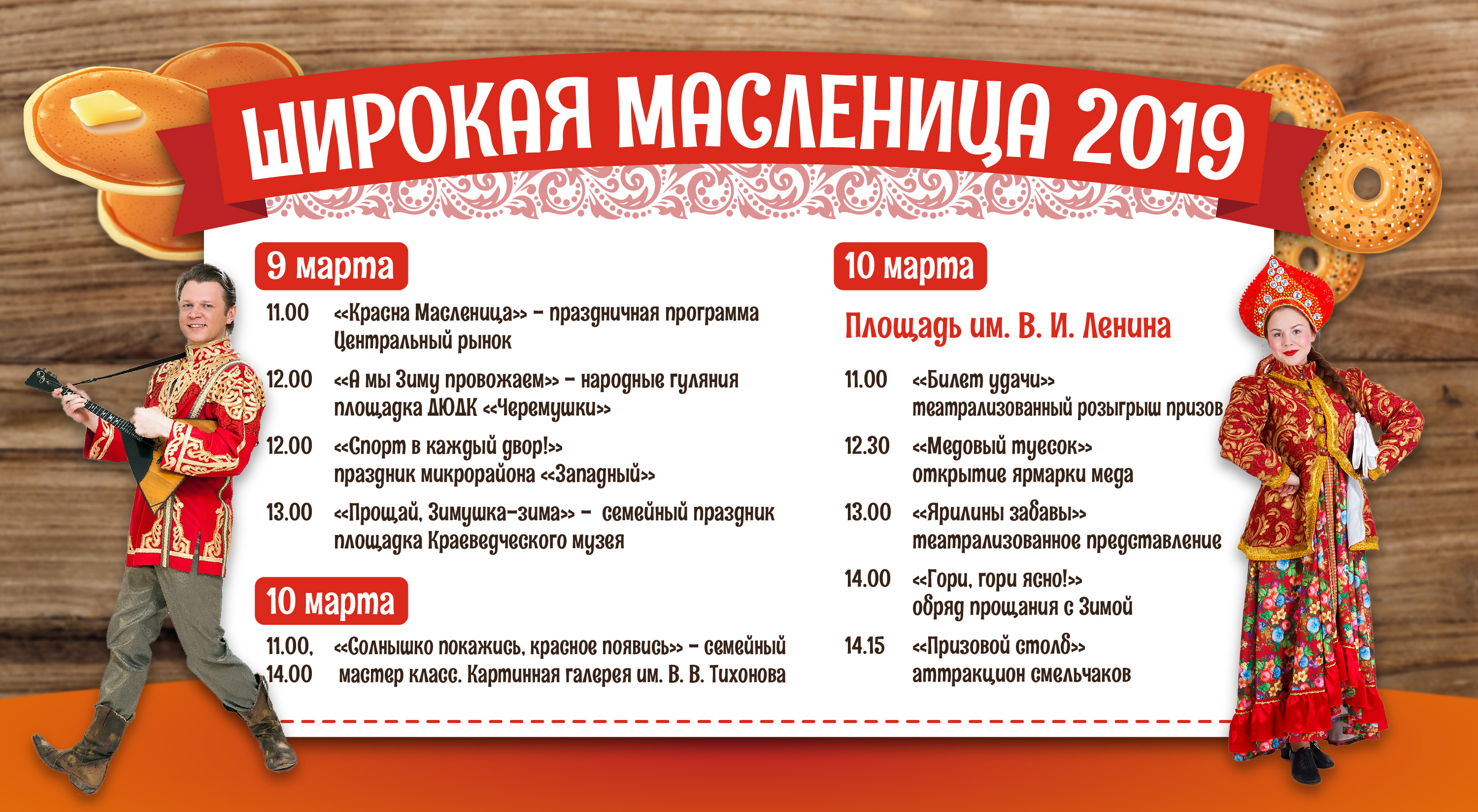 12.00 «А мы Зиму провожаем» - народные гуляния площадка ДЮДК «Черемушки» 12.00 «Спорт - в каждый двор!» - праздник микрорайона «Западный»