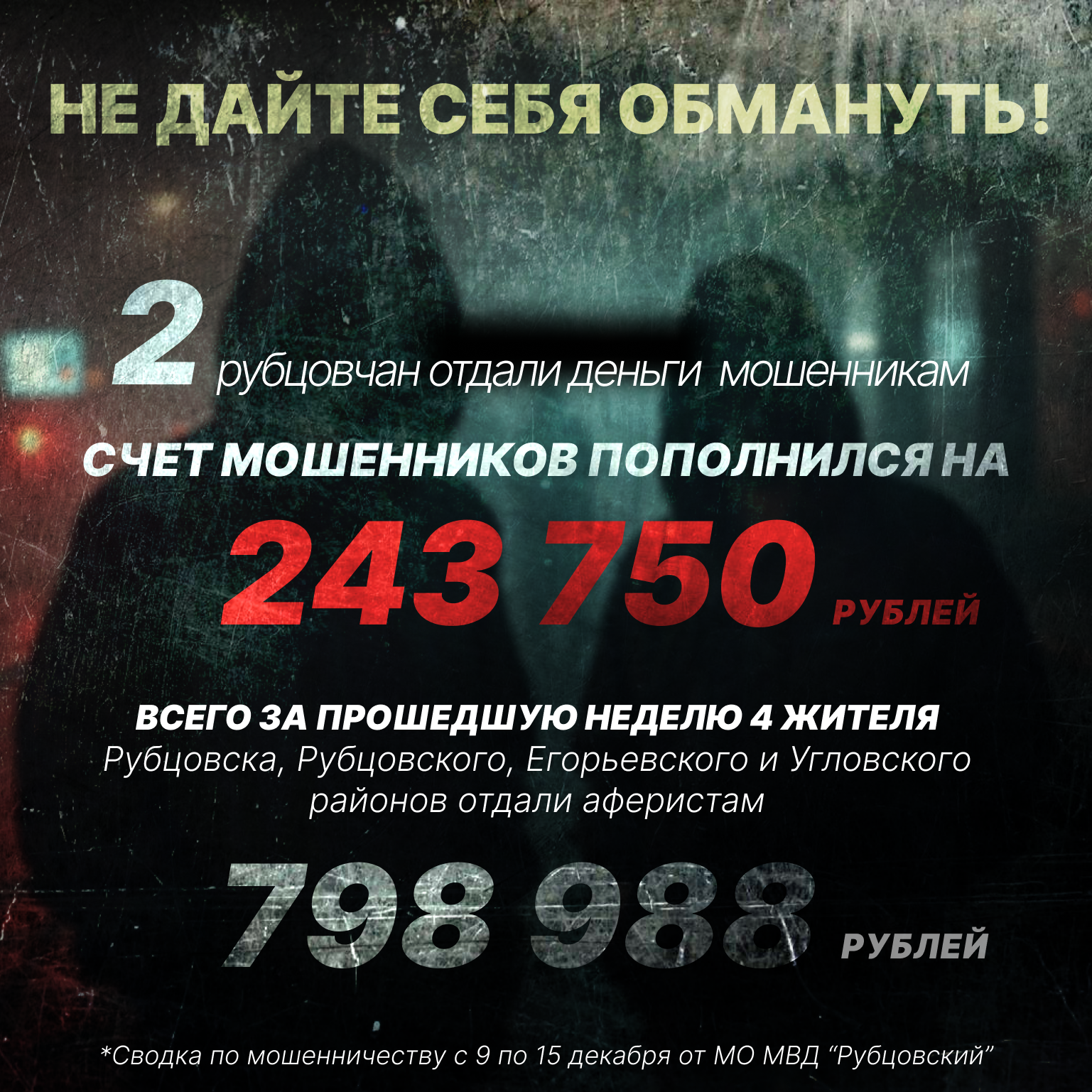 За прошедшую неделю с 9 по 15 декабря двое рубцовчан отдали свои деньги мошенникам. Счет злоумышленников пополнился на 243 750 рублей. Еще два жителя Рубцовского района попали в сети аферистов, лишившись при этом 555 238 рублей. Всего на территории ответственности МО МВД России «Рубцовский» граждане отдали аферистам 798 988 рублей. Будьте бдительны! Не дайте себя обмануть!