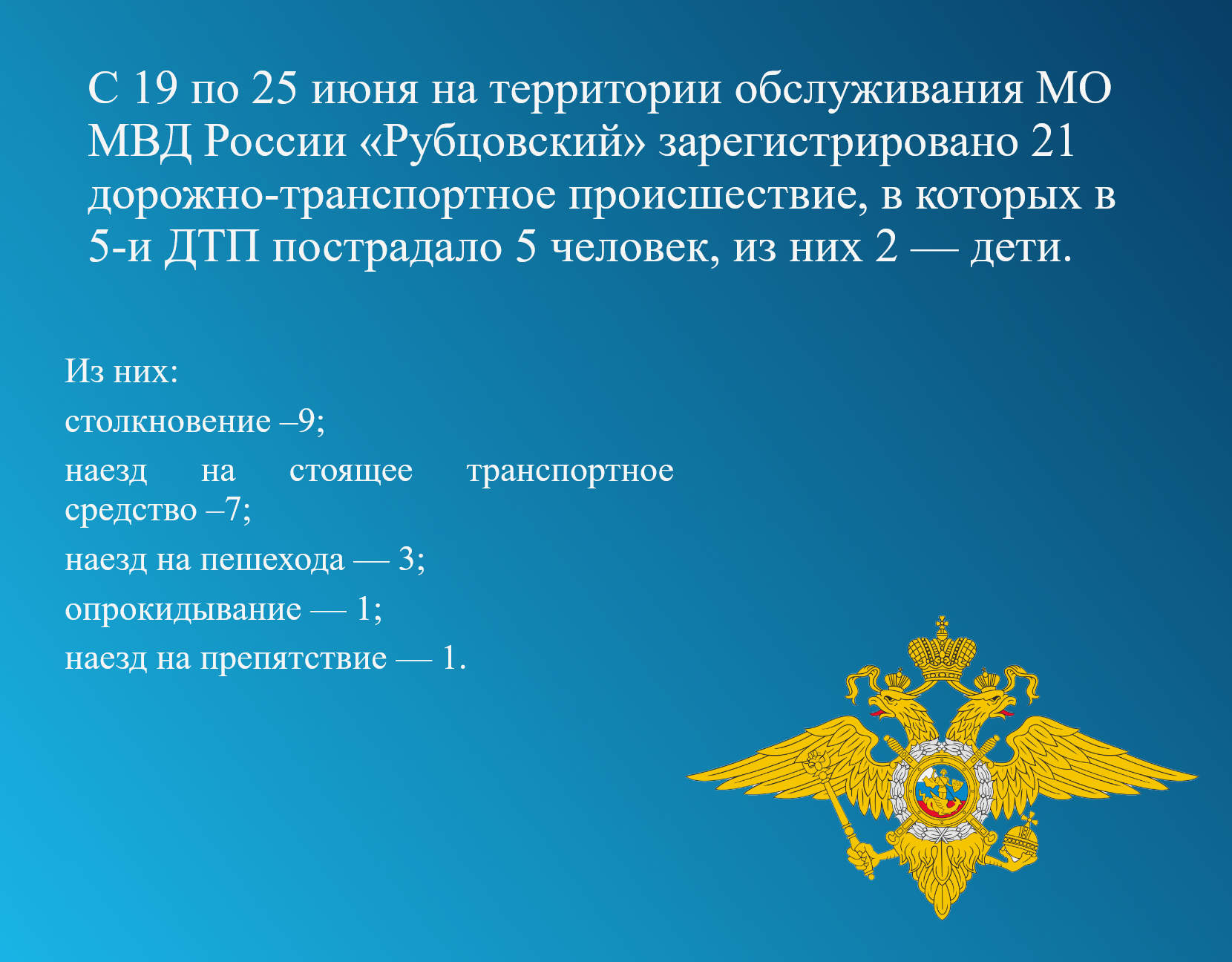 С 26 июня по 2 июля 2023 года на территории обслуживания МО МВД России «Рубцовский» зарегистрировано 11 дорожно-транспортных происшествий, из которых в 3-х ДТП пострадало 3 человека.