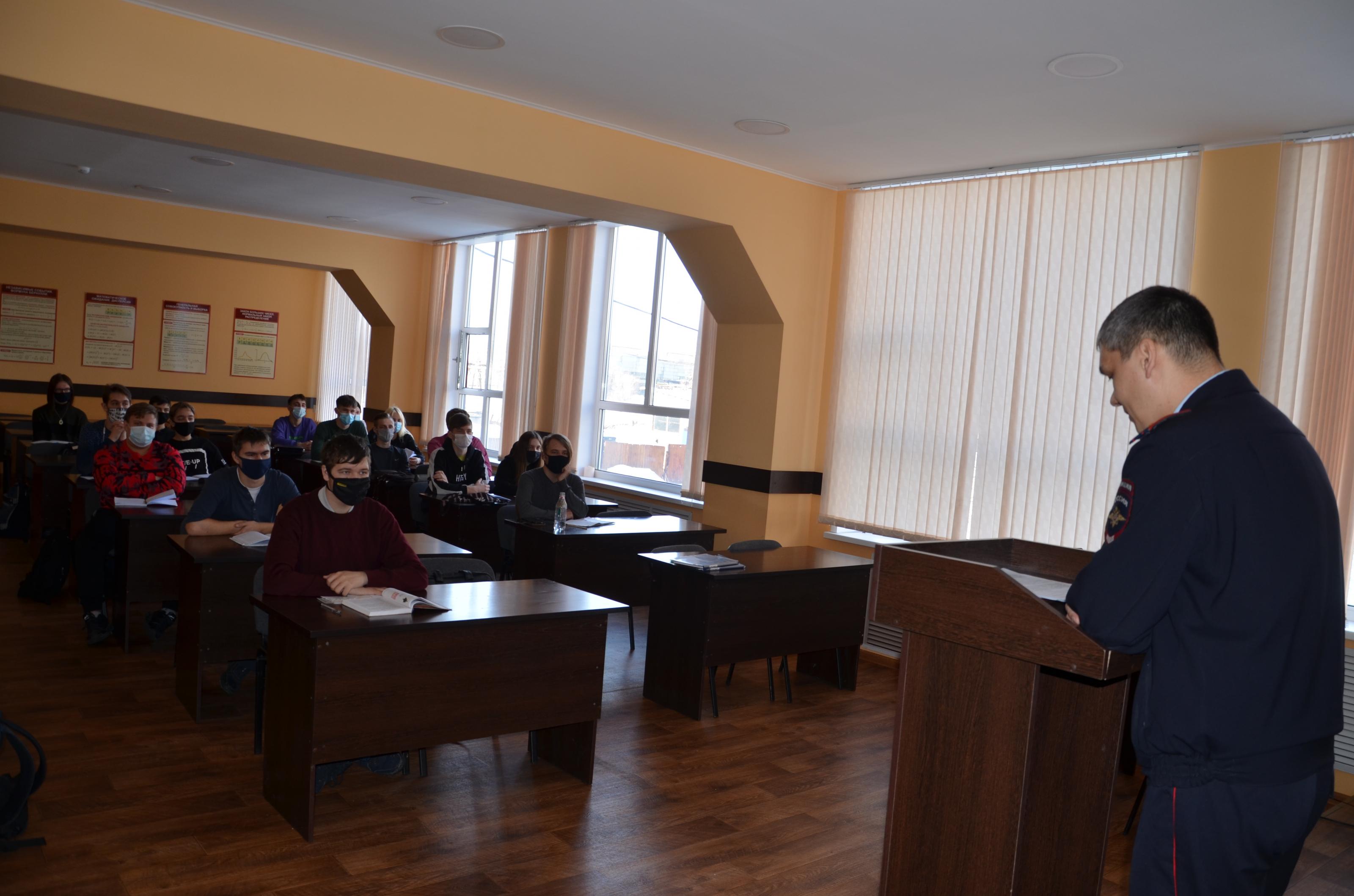 Мероприятие состоялось в рубцовском филиале Алтайского государственного университета. Заместитель начальника отдела дознания МО МВД России «Рубцовский» майор полиции Максим Самойлов рассказал студентам о наиболее распространенных на территории города преступлениях, связанных с хищениями чужого имущества, таких, как кража и мошенничество. Особое внимание сотрудник полиции уделил необходимости соблюдения мер по сохранности личного имущества и денежных средств и предупредил о возможных звонках от потенциальных мошенников, которые могут представляться сотрудниками правоохранительных органов (полиции, прокуратуры, ФСБ), сотрудниками банков и иных финансовых организаций.