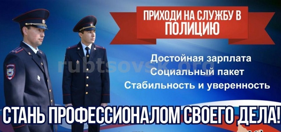 МО МВД России «Рубцовский» объявляет набор кандидатов на должности участковых уполномоченных полиции. Предъявляемые требования: - гражданство РФ; -служба в Вооруженных Силах РФ; -возраст от 18 до 35 лет. - образование: высшее, среднее профессиональное (юридическое). Полный социальный пакет, заработная плата 35-50 тысяч рублей, льготный проезд к месту проведения отпуска сотруднику полиции и члену его семьи, санаторное лечение и другие гарантии.