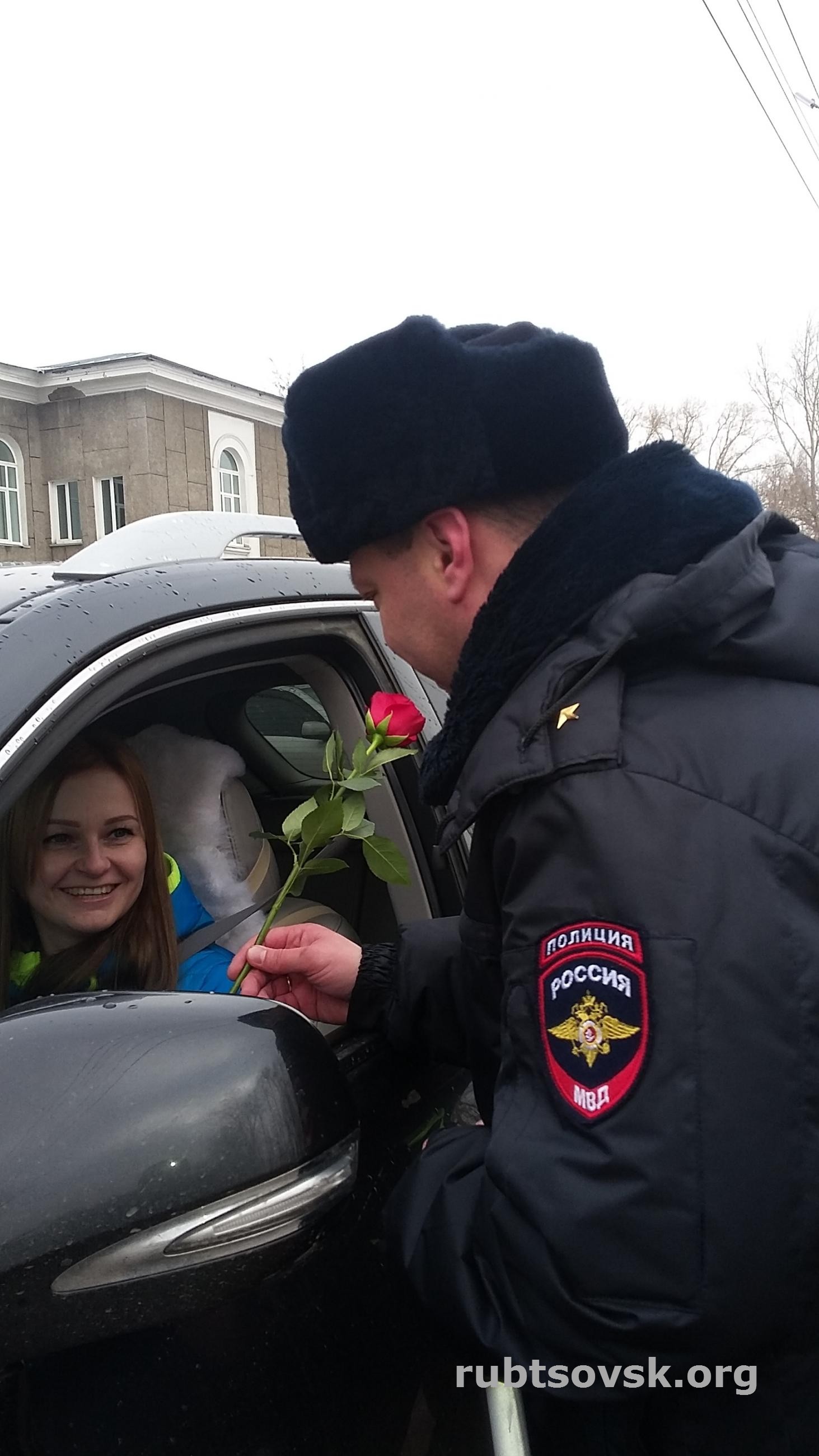 Накануне празднования Международного женского дня сотрудники Госавтоинспекции г. Рубцовска приготовили женщинам – водителям праздничный сюрприз. Инспектора ДПС останавливали автомобили под управлением представительниц прекрасного пола и вместо привычной проверки документов, дарили женщинам цветы, говорили теплые слова поздравления и напоминали дамам о необходимости соблюдения правил дорожного движения.