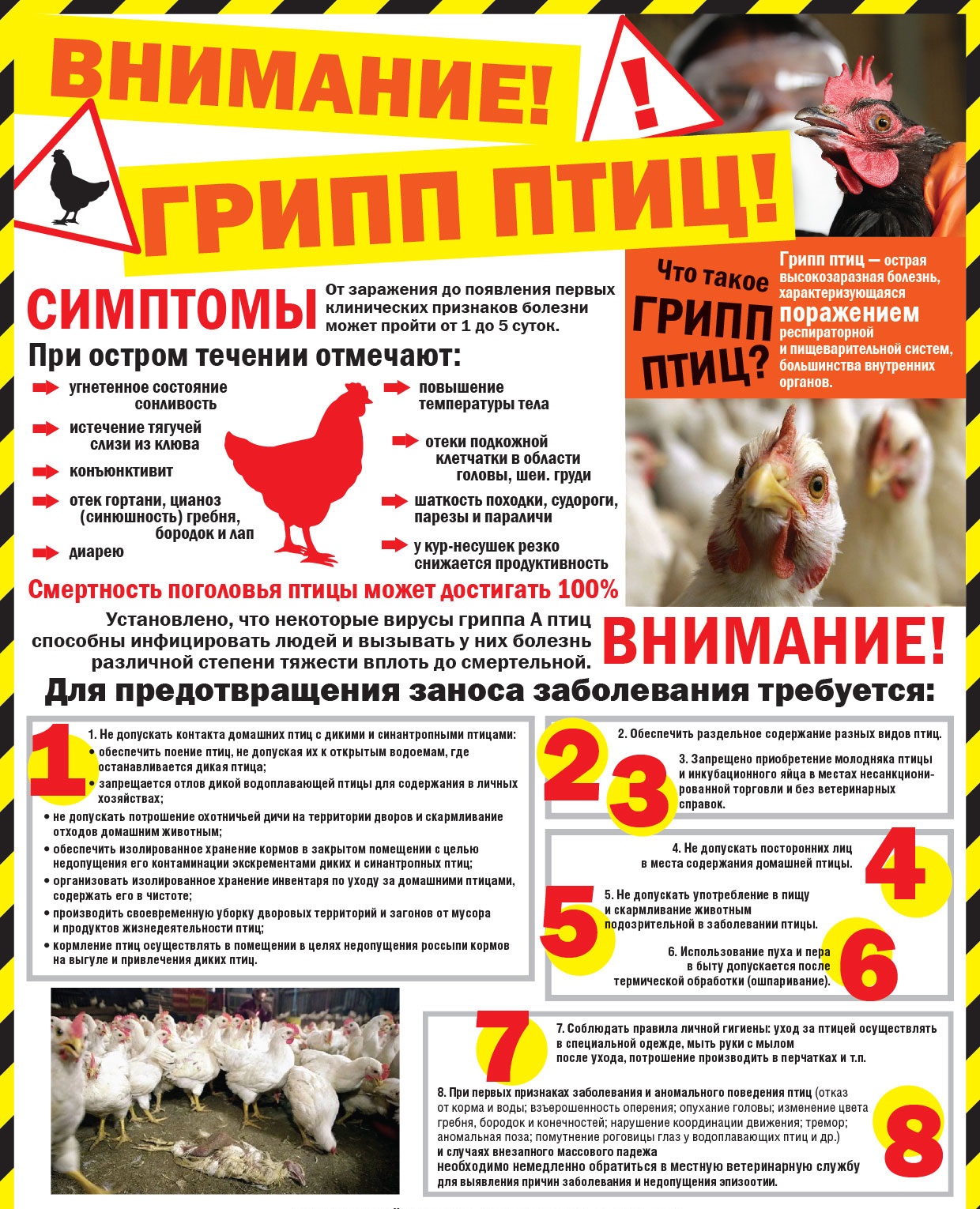 ВЫСОКОПАТОГЕННЫЙ ГРИПП ПТИЦ — острая контагиозная вирусная инфекция домашних и диких птиц, характеризующаяся общим угнетением, отеками, множественными кровоизлияниями и поражениями внутренних органов, мозга и кожи. К высокопатогенному гриппу восприимчивы все виды птиц, в том числе куры, индейки, утки, фазаны, цесарки, перепела, глухари, аисты, чайки и практически все виды синантропных птиц (голуби, воробьи, вороны, чайки, утки, галки и пр.), дикие, экзотические и декоративные птицы, а также свиньи, лошади, хорьки, мыши, кошки, собаки, иные позвоночные и человек. Наиболее чувствительны к вирусу цыплята и индейки. У кур заболевание, вызванное высокопатогенным штаммом вируса, часто протекает молниеносно, бессимптомно и приводит к 100%-ному летальному исходу.