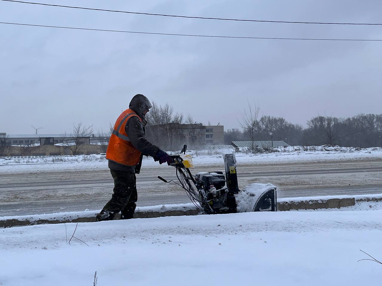 Коммунальщики всю ночь занимались очисткой городских улиц от снега, а с раннего утра дворники расчищают тротуары и остановочные площадки, обрабатывая их пескосоляной смесью.