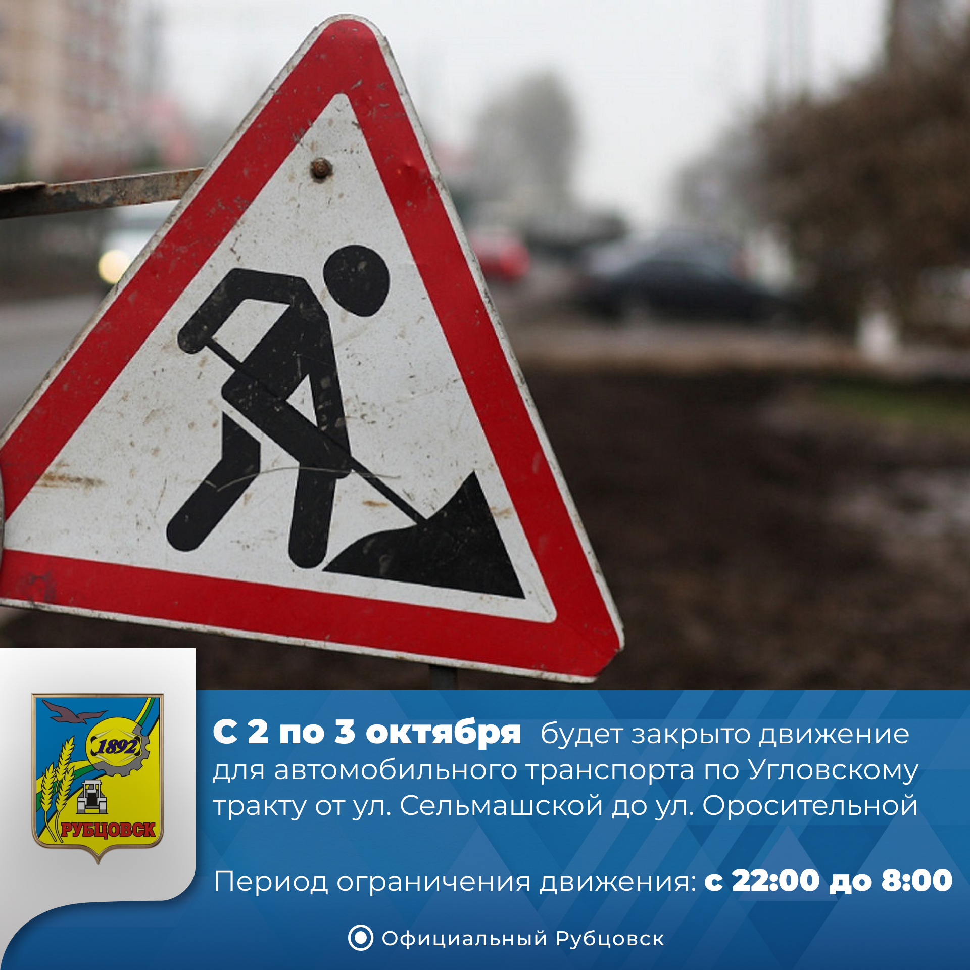 Внимание! В период с 2 по 3 октября (с 22:00 до 08:00) будет закрыто движение для автомобильного транспорта по Угловскому тракту от ул. Сельмашской до ул. Оросительной.