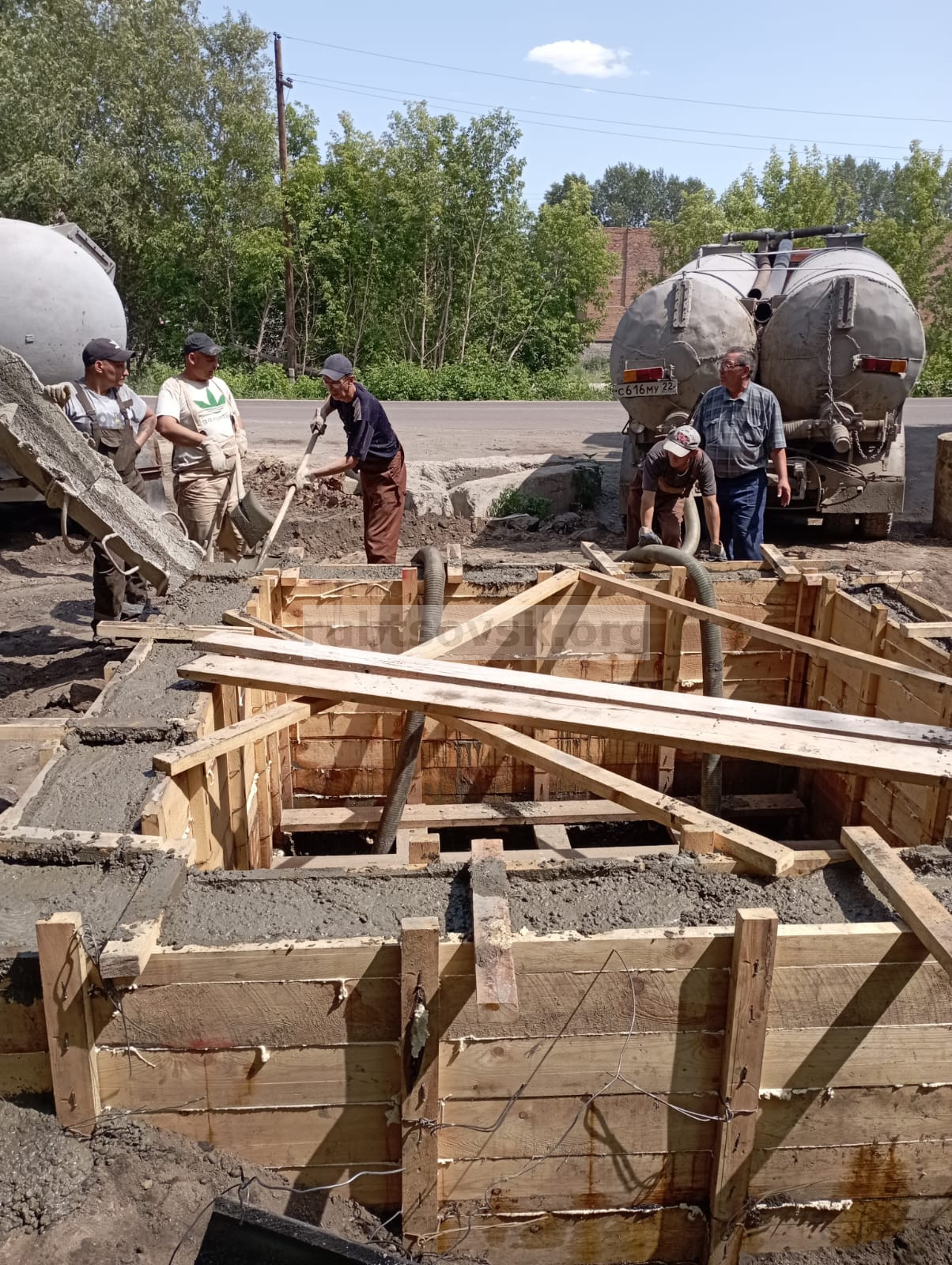 Уже проведены работы по обваловке колодца грунтом, выполнена заливка опалубки бетоном.