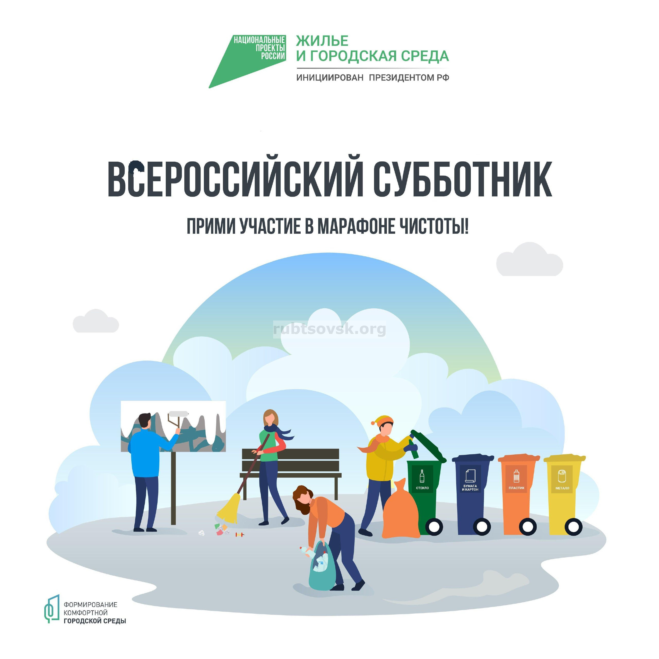 Уважаемые рубцовчане! 28 апреля приглашаем на Общероссийский субботник. В нашем городе он пройдет по пр-кту Ленина от пер. Гражданского до пер. Улежникова, в сквере Комсомольской славы, на ул. Тракторной.