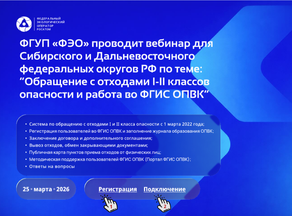 Федеральное государственное унитарное предприятие «Федеральный экологический оператор» 25 марта с 9:30 до 11:30 (по московскому времени) проводит обучающий вебинар для юридических лиц и индивидуальных предпринимателей, в том числе управляющих компаний, организующих пункты приема (места накопления) отходов I и II классов опасности от физических лиц, осуществляющих деятельность на территории Сибирского федерального округа.