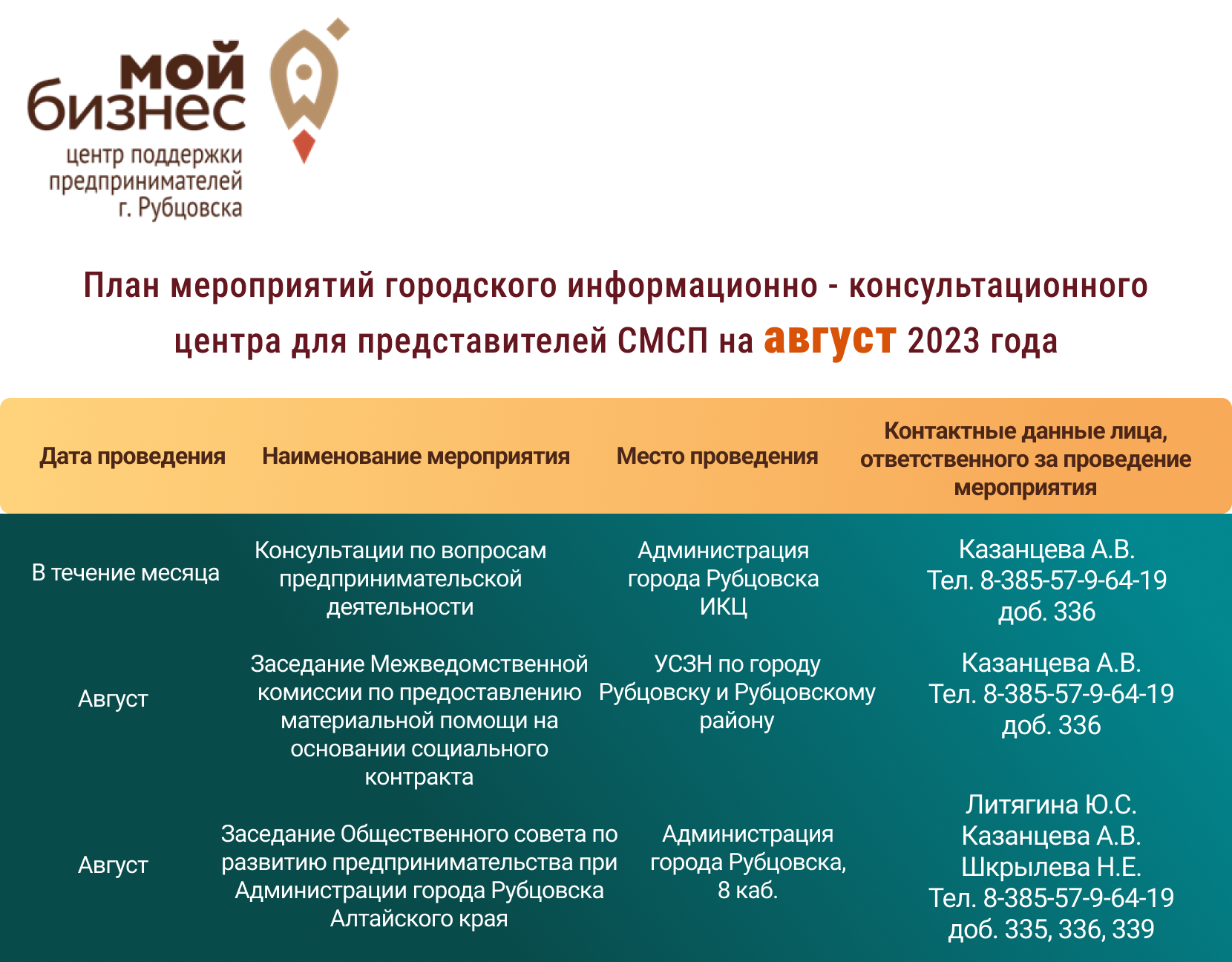 Центр «Мой бизнес» приглашает вас принять участие в тренинге «Бизнес-план для социального контракта» для потенциальных и начинающих предпринимателей по разработке бизнес-плана и финансового расчета своего бизнеса, который пройдет 15 августа.
