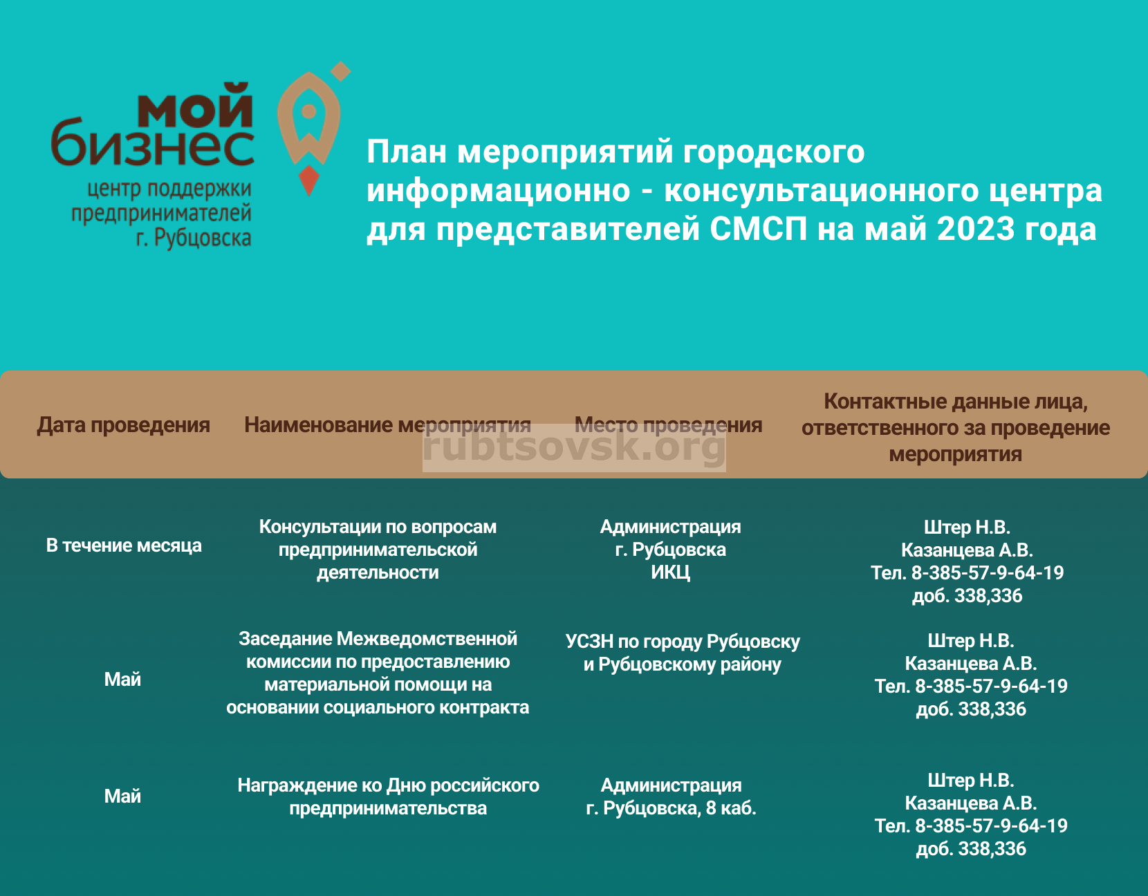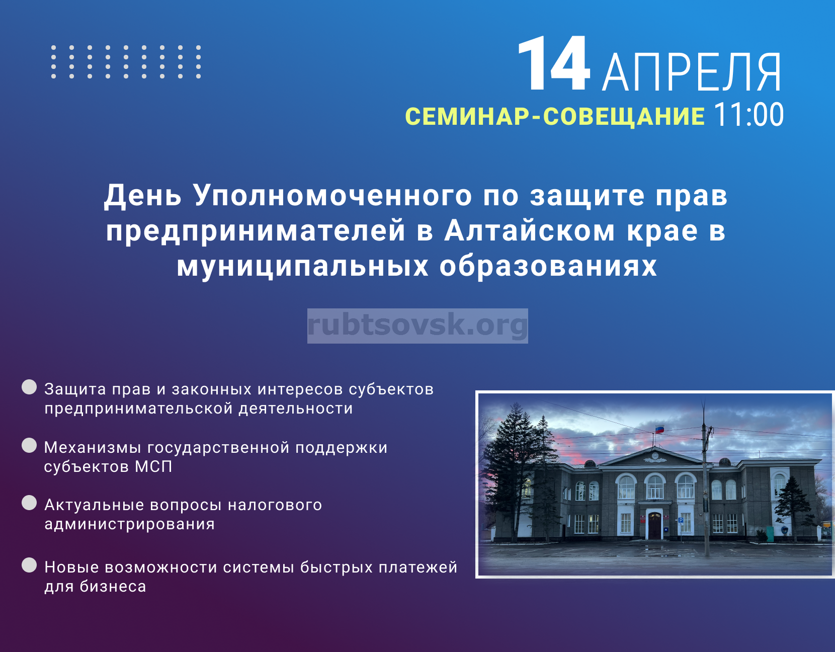 14 апреля 2023 года в 11-00 в большом зале Администрации города Рубцовска Алтайского края в рамках реализации проекта «День Уполномоченного по защите прав предпринимателей в Алтайском крае в муниципальных образованиях» состоится семинар - совещание c бизнес-сообществом.