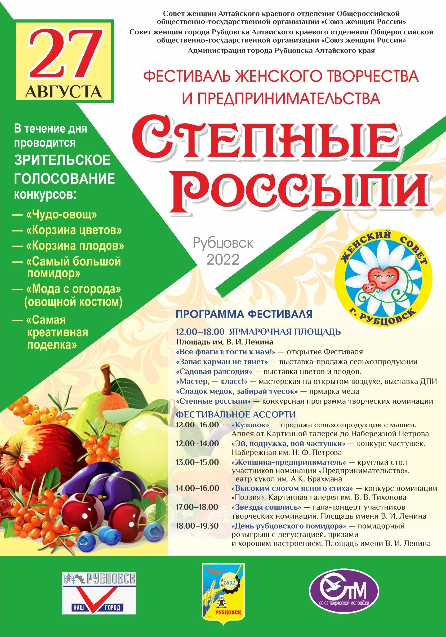 27 августа 2022 года на пл. имени В.И. Ленина, в рамках фестиваля женского творчества и предпринимательства «Степные россыпи», с 12.00 до 20.00 будет проходить универсальная ярмарка. Приглашаем всех желающих посетить ярмарку и приобрести местную продукцию.