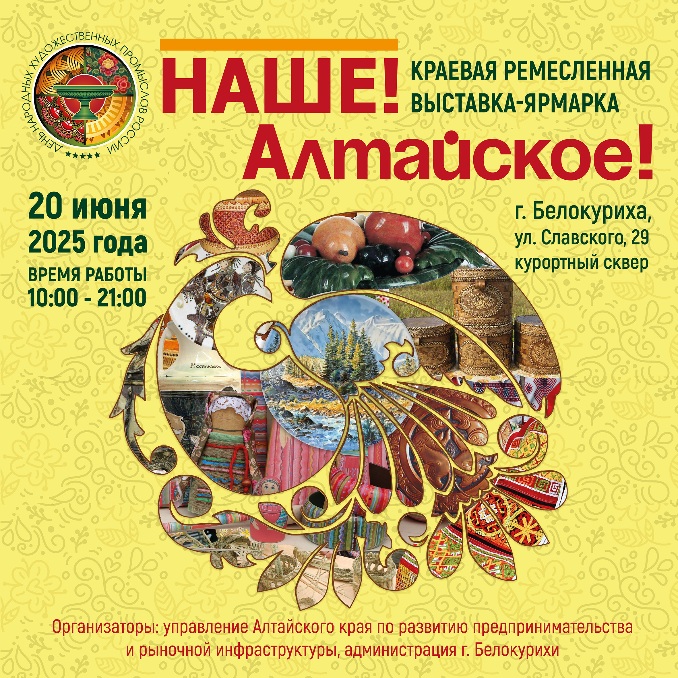 20 июня в курортном городе Белокурихе на открытой площадке напротив санатория «Алтайский замок» (ул. Славского, 29) пройдет традиционная краевая ремесленная выставка-ярмарка «НАШЕ! Алтайское!», организованная в рамках национального проекта «Эффективная и конкурентная экономика». На ежегодной ярмарочной площадке соберутся более 50 предпринимателей и самозанятых граждан, осуществляющих деятельность в области народных промыслов и ремесел. Мастера-ремесленники из городов Барнаула, Бийска, Белокурихи, Новоалтайска, Рубцовска, а также Змеиногорского, Зонального, Петропавловского, Родинского, Смоленского, Тальменского, Целинного, Чарышского районов представят сувенирные и ремесленные изделия ручной работы по различным направлениям ремесленной деятельности.