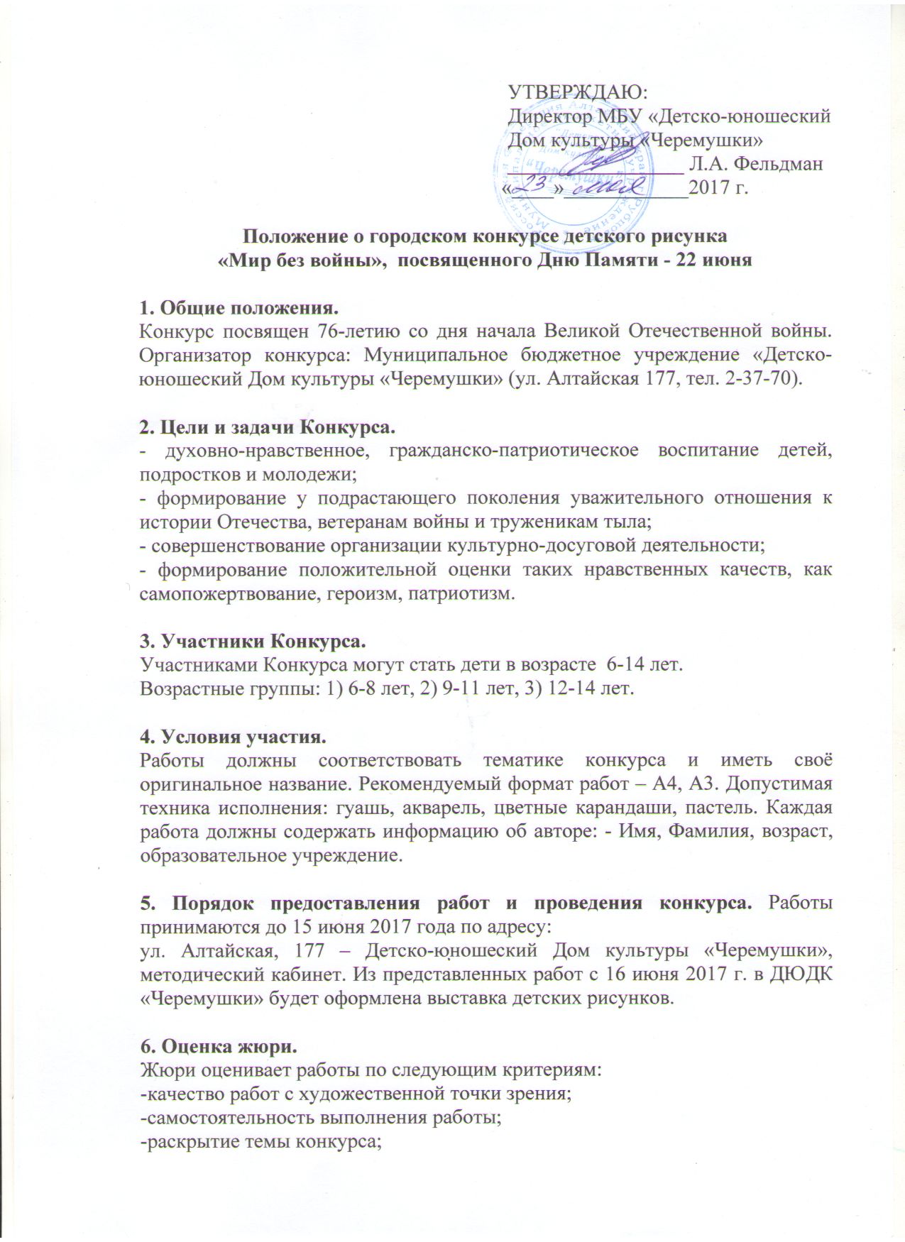 Детско-юношеский Дом культуры «Черемушки» объявляет о конкурсе рисунков, посвященном 76-летию со дня начала Великой Отечественной войны. Участниками могут стать дети в возрасте от 6 до 14 лет. Работы должны соответствовать тематике конкурса и иметь своё оригинальное название.