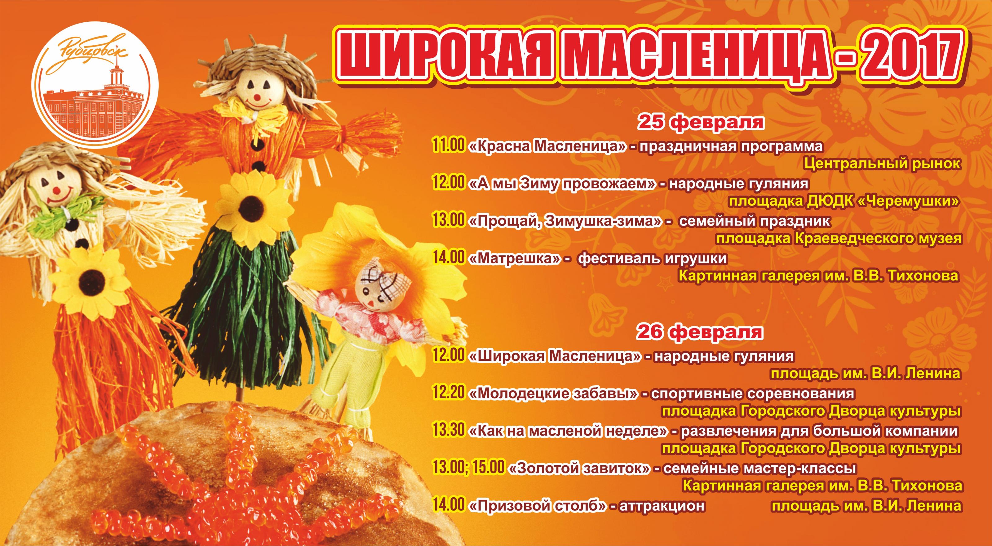 В программу включены мероприятия, которые пройдут в различных частях города 25 и 26 февраля. Кульминацией празднования традиционно станет большая концертно-игровая программа на площади имени Ленина. Приглашаем рубцовчан посетить яркие и веселые масленичные гуляния, отведать продукцию местных кулинаров, купить памятные сувениры, проводить Зиму и, наконец-то, встретить Весну!