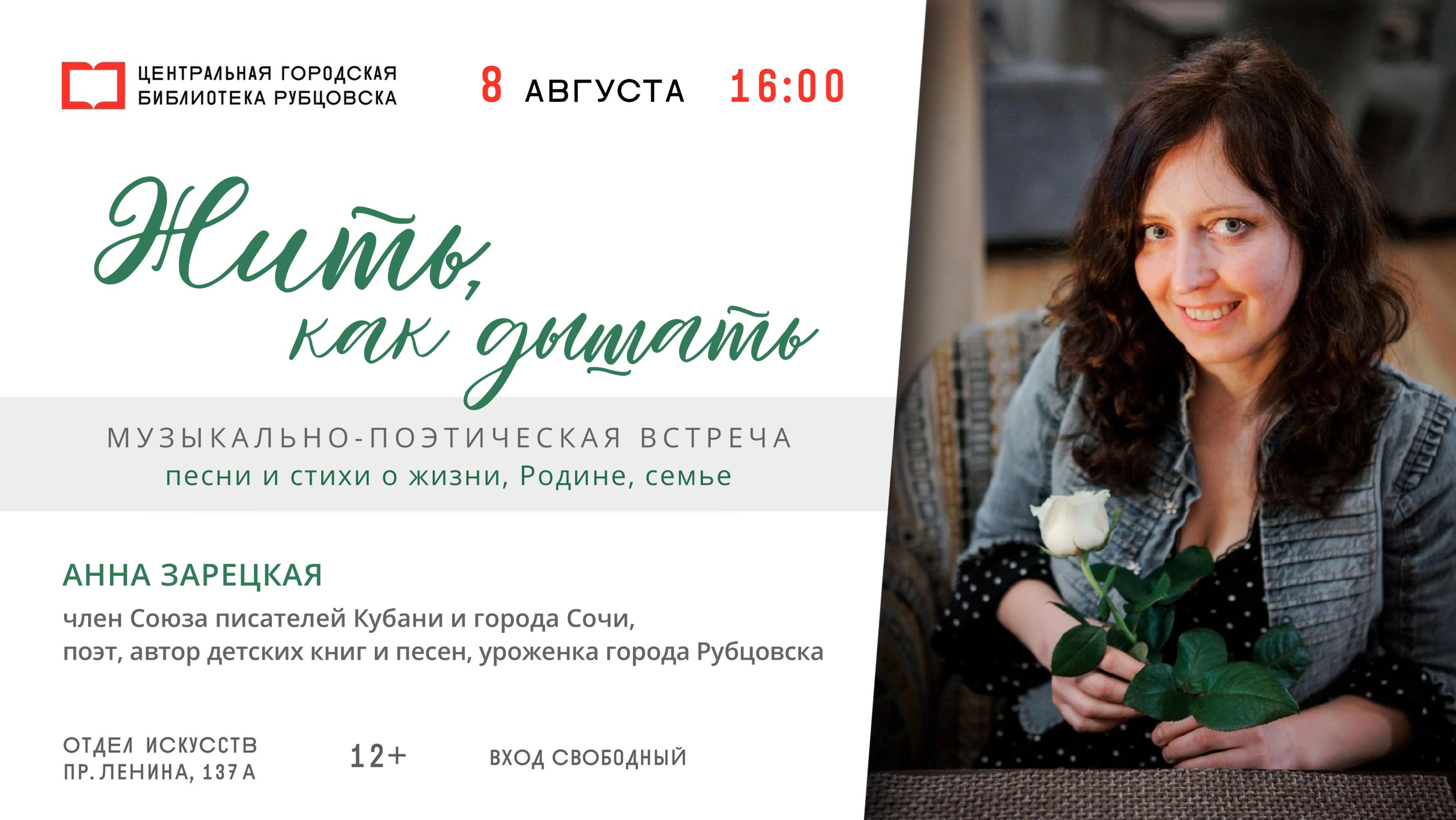 8 августа в 16:00 в Центральной городской библиотеке состоится творческая встреча с поэтессой, певицей и автором детских книг Анной Зарецкой. Анна представит музыкально-поэтическую программу «Жить, как дышать», в которой прозвучат её стихи и песни о жизни, Родине и семье.