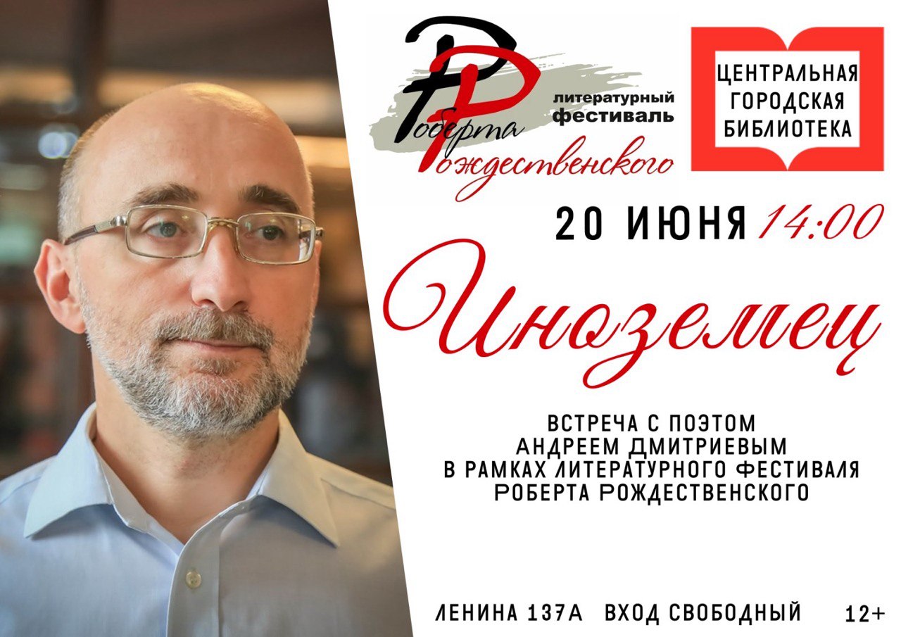 20 июня в 14:00 в рамках Литературного фестиваля Р. Рождественского в центральной городской библиотеке состоится встреча с поэтом Андреем Дмитриевым. Андрей Владимирович родился в городе Доброполье Донецкой области. Окончил факультет журналистики Киевского государственного университета им. Т.Г. Шевченко. Преподавал русский язык и литературу в школе в Киеве и Харькове. Занимался журналистикой.