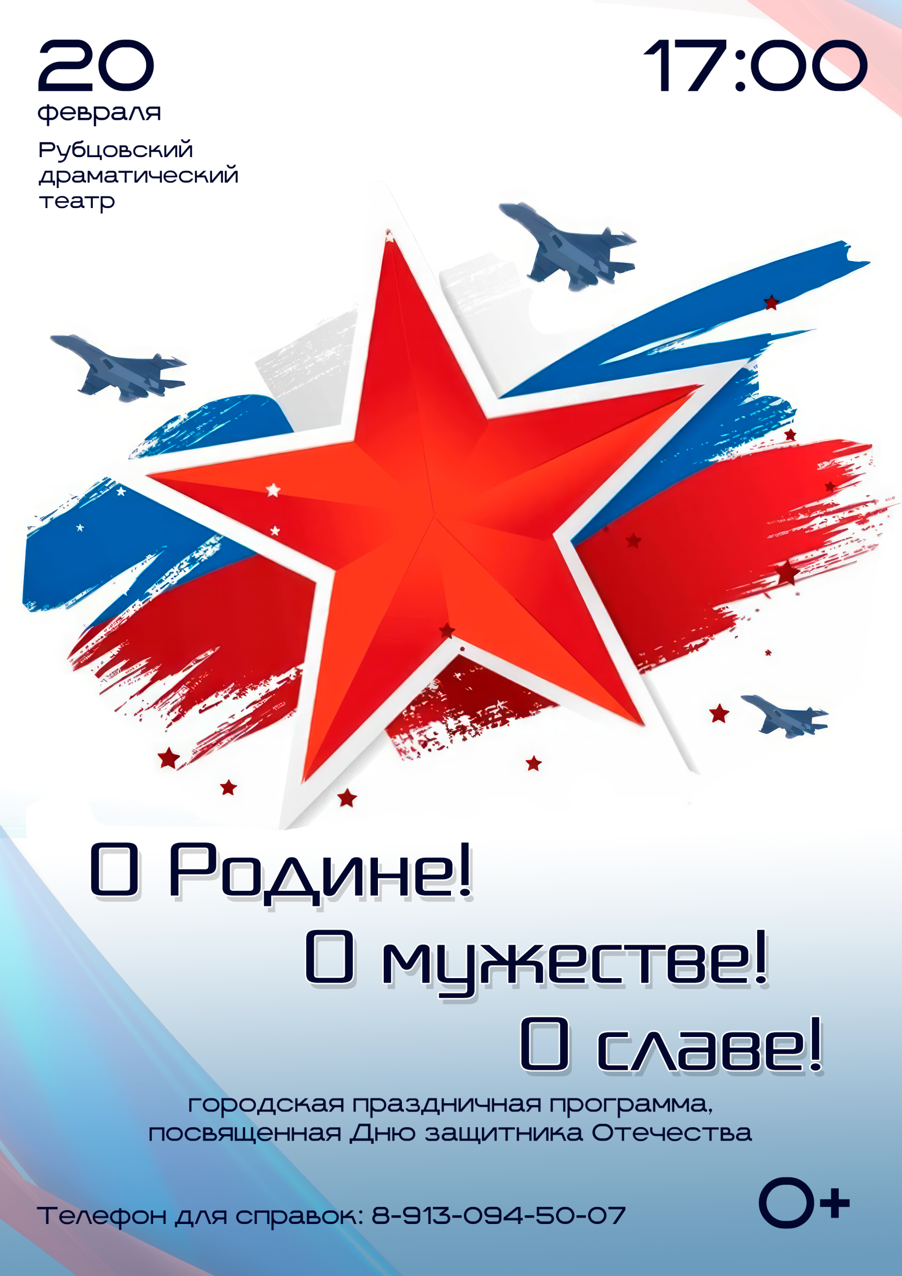 20 февраля в 17:00 в Рубцовском драматическом театре состоится городская праздничная концертная программа «О Родине! О мужестве! О славе!».