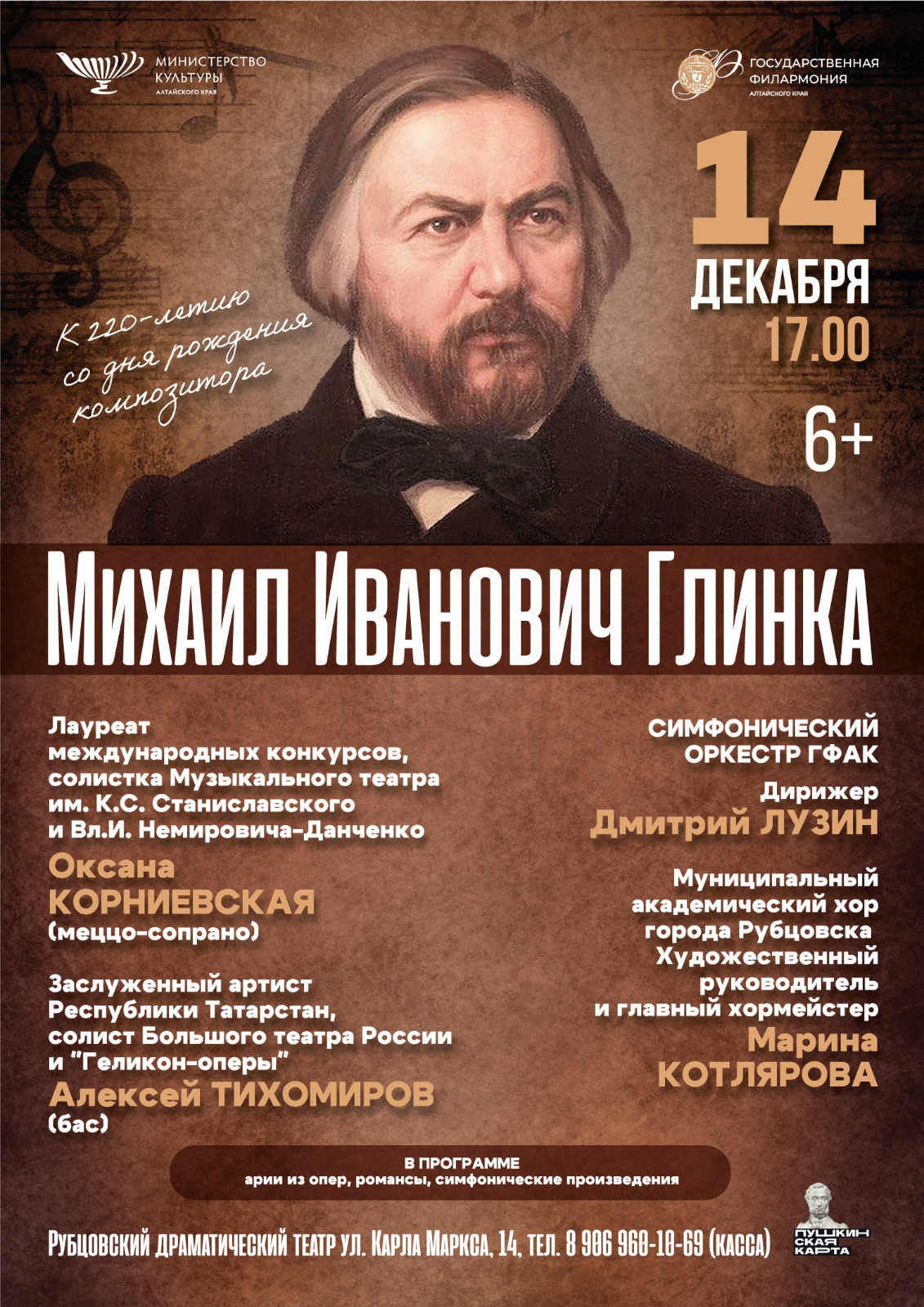 В Рубцовске состоится концерт, посвящённый 220-летию со дня рождения выдающегося русского композитора Михаила Ивановича Глинки.
