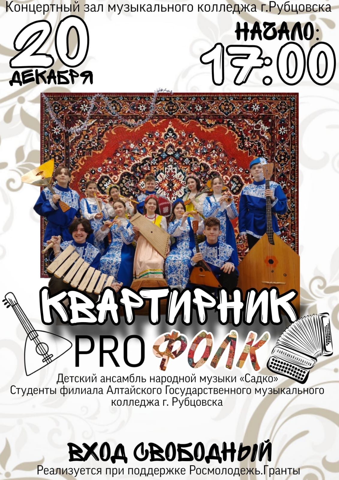 Детский ансамбль народной музыки «Садко» и студенты филиала «Алтайского государственного музыкального колледжа» в городе Рубцовске в преддверии Нового года приглашает посетить квартирник в стиле PRO ФОЛК.
