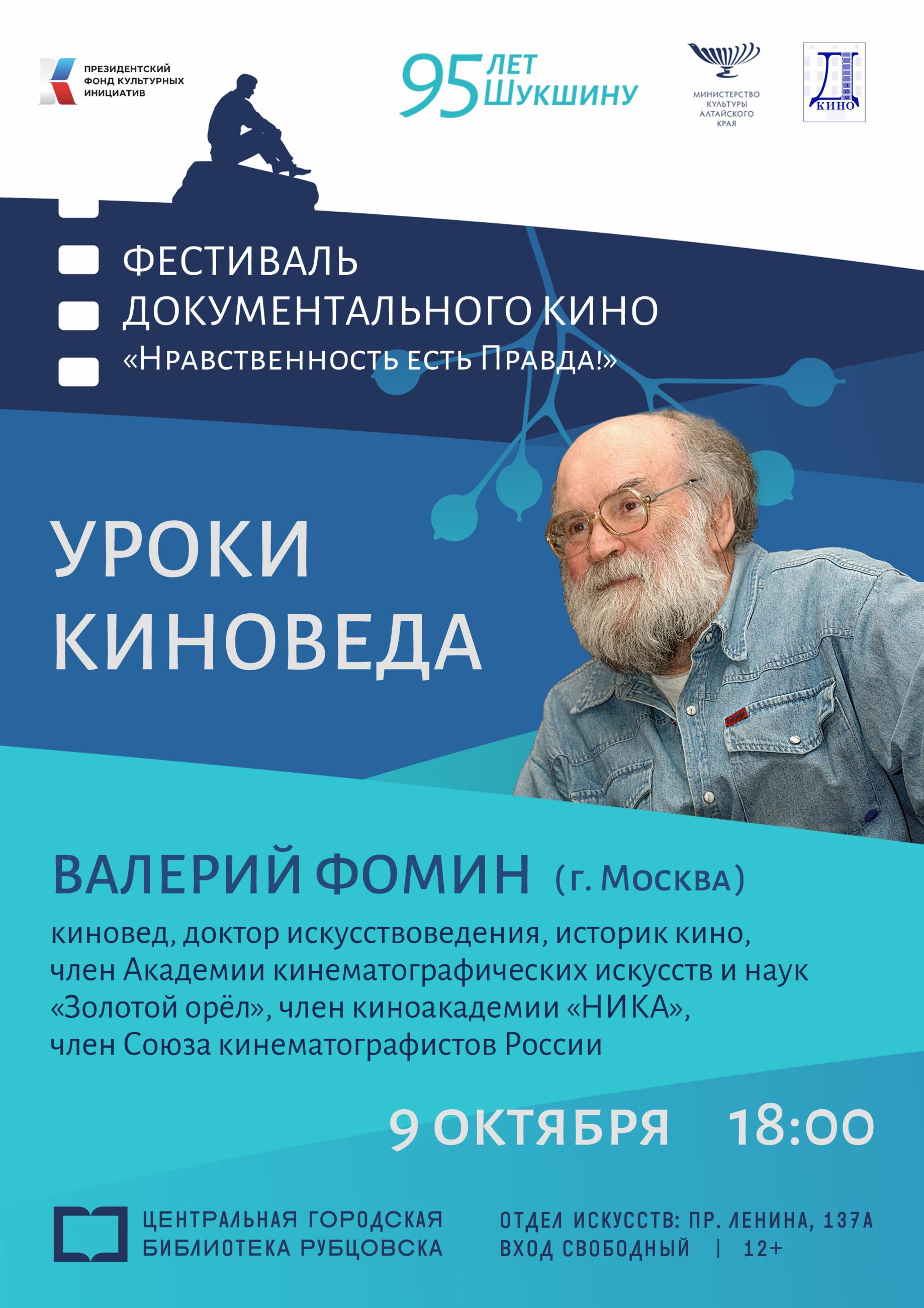 «УРОКИ КИНОВЕДА» пройдут в Центральной городской библиотеке Авторитетнейший историк отечественного кино и киновед Валерий Фомин приедет в Рубцовск через полстраны, чтобы рассказать нам о том, как смотреть и понимать кино, считывать его смыслы. Валерий Фомин – автор множества книг и статей, на нашей встрече он представит свою новую книгу. Лично знавший Василия Шукшина, видевший его в процессе съёмок фильмов «Живет такой парень», «Печки-лавочки» и «Калина красная», Валерий Иванович поделится своими воспоминаниями о нашем выдающемся земляке.