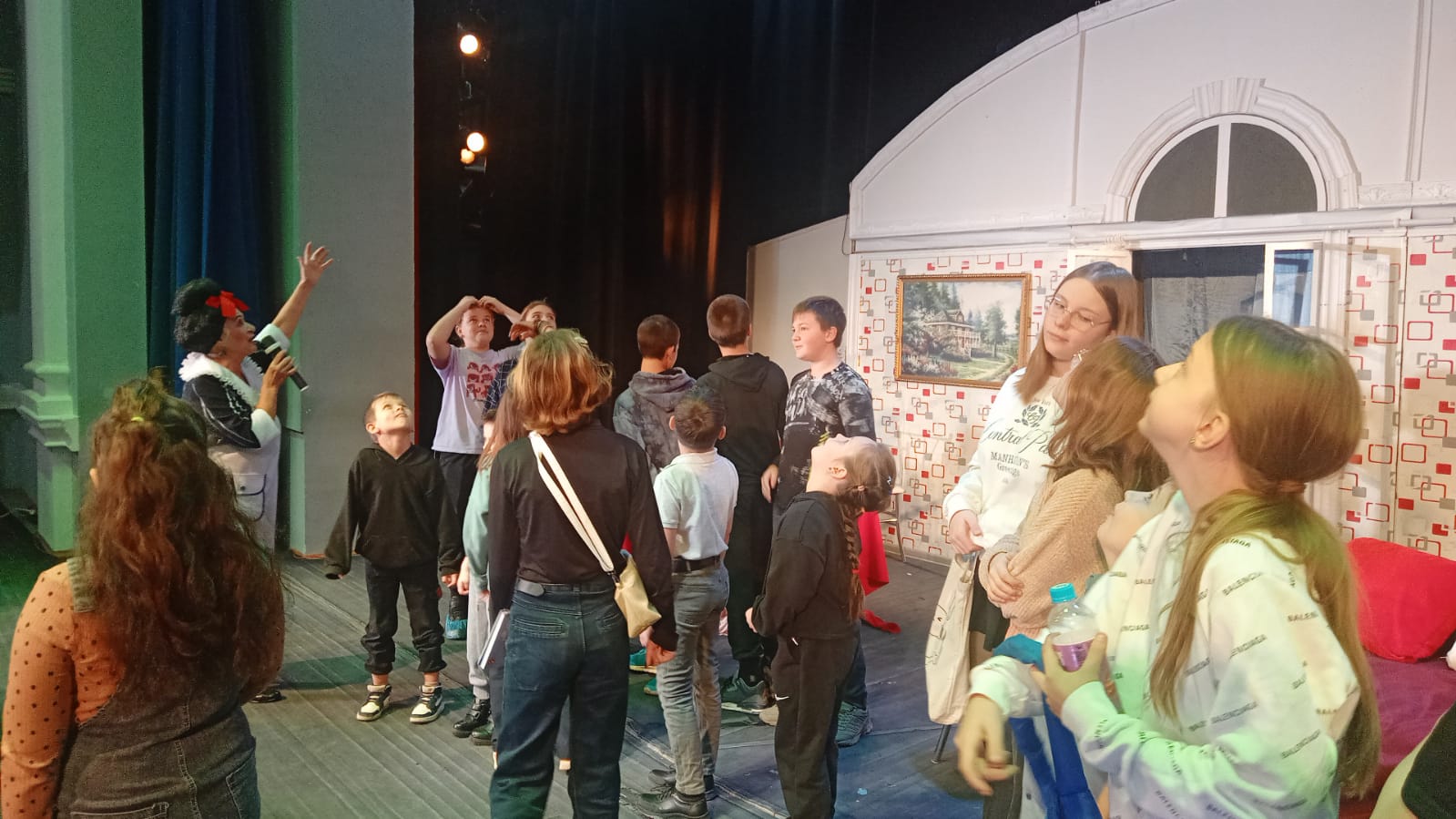 Ребята смогли побывать на сцене, посмотреть вблизи декорации, затем артисты им рассказали об истории театра и о том, как проходит подготовка к спектаклям.