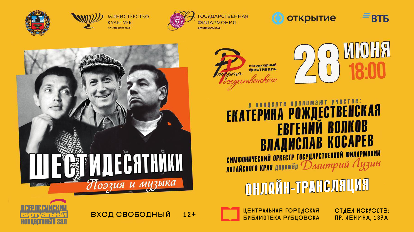 28 июня в 18:00 Центральная городская библиотека приглашает на прямую трансляцию концерта «Шестидесятники Поэзия и музыка». Концерт состоится в Государственной филармонии Алтайского края в рамках Литературного фестиваля Роберта Рождественского. Программа представляет собой уникальный проект, в котором дочь поэта Екатерина Рождественская, артист Евгений Волков и певец Владислав Косарев погрузят зрителей в удивительный мир ярких и многогранных образов поэзии эпохи «оттепели».