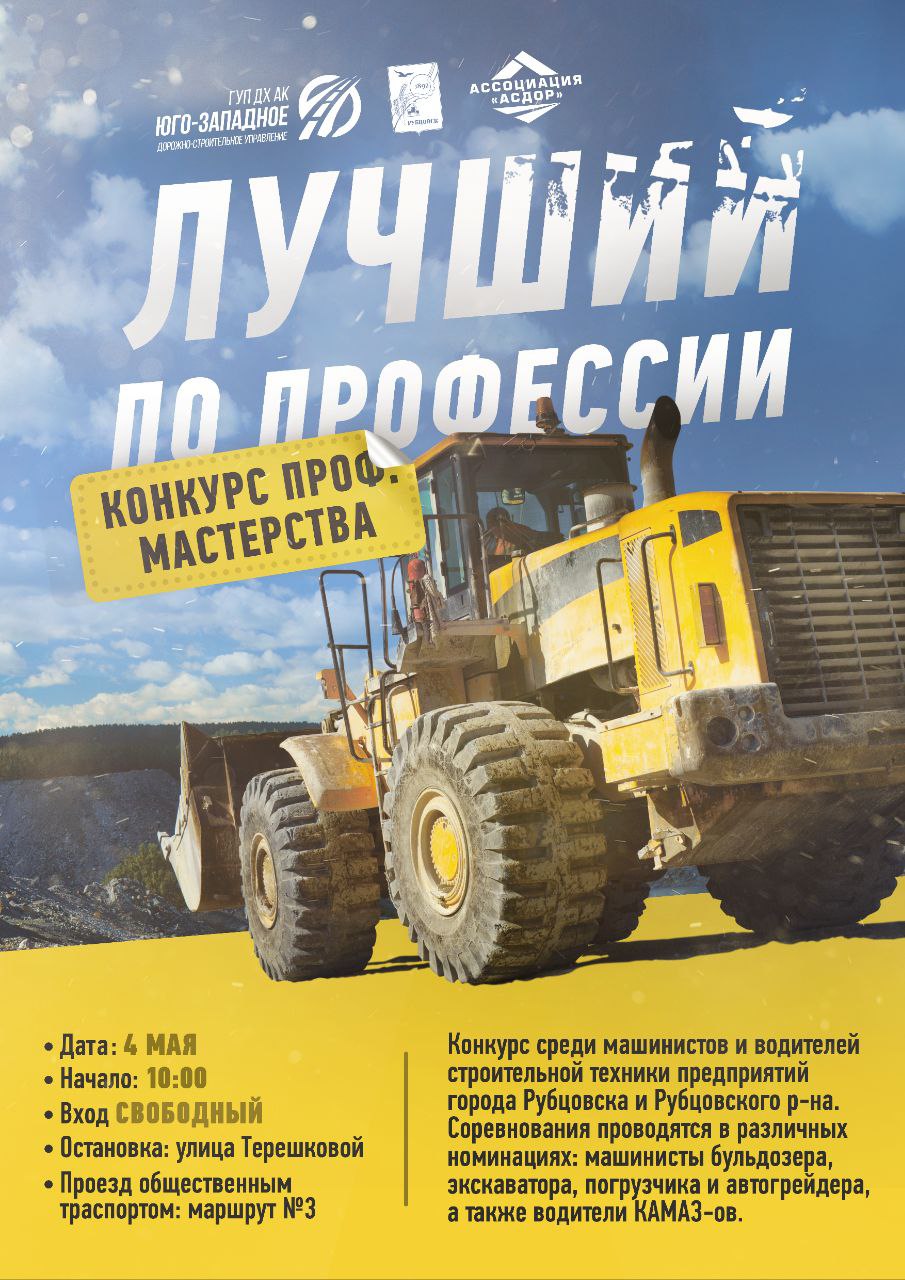 4 мая в районе улицы Терешковой пройдет конкурс среди работников строительных профессий «Лучший по профессии-2024». Организаторы конкурса - Администрация Рубцовска и ГУП ДХ АК «Юго-Западное ДСУ». Конкурс является открытым, принять участие могут машинисты и водители строительной техники предприятий Рубцовска и Рубцовского района.