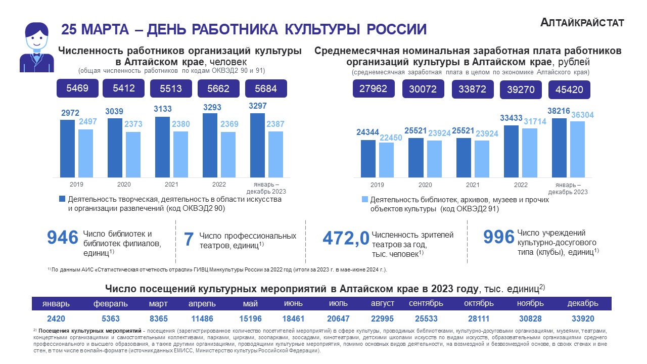 По данным за январь-декабрь 2023 года в организациях культуры Алтайского края занято 5684 человека, из них творческой деятельностью в области искусства и организации развлечений – 3297 человек, в библиотеках, архивах, музеях и прочих объектах культуры – 2387 человек. Средний размер номинальной заработной платы работников, занятых творческой деятельностью в области искусства и организации развлечений – 38216 рублей (84,1% от размера среднемесячной заработной платы в целом по краю), в библиотеках, архивах, музеях и прочих объектах культуры – 36304 рублей (79,9% от краевого уровня).