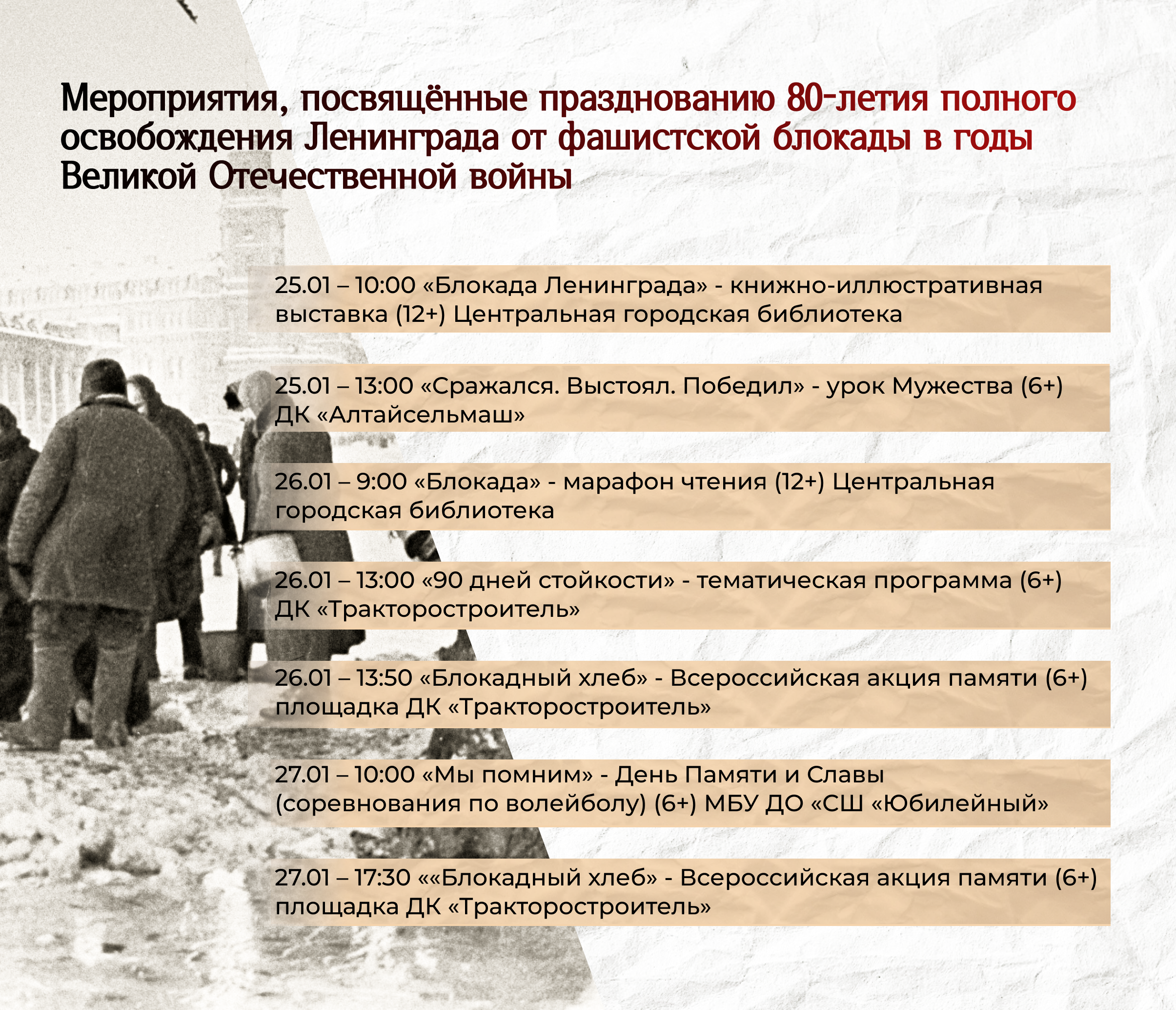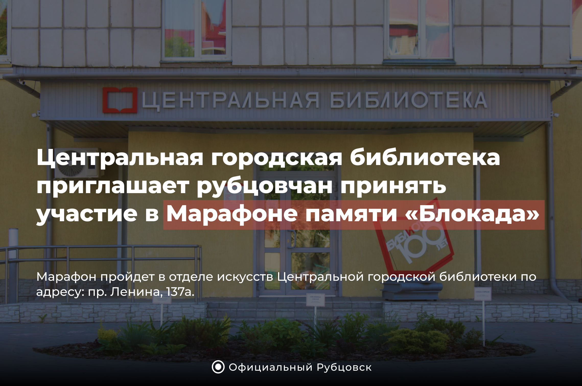 В год 80-летия полного освобождения города Ленинграда от фашистской блокады Центральная городская библиотека приглашает жителей Рубцовска принять участие в Марафоне памяти «Блокада», который состоится 26 января.