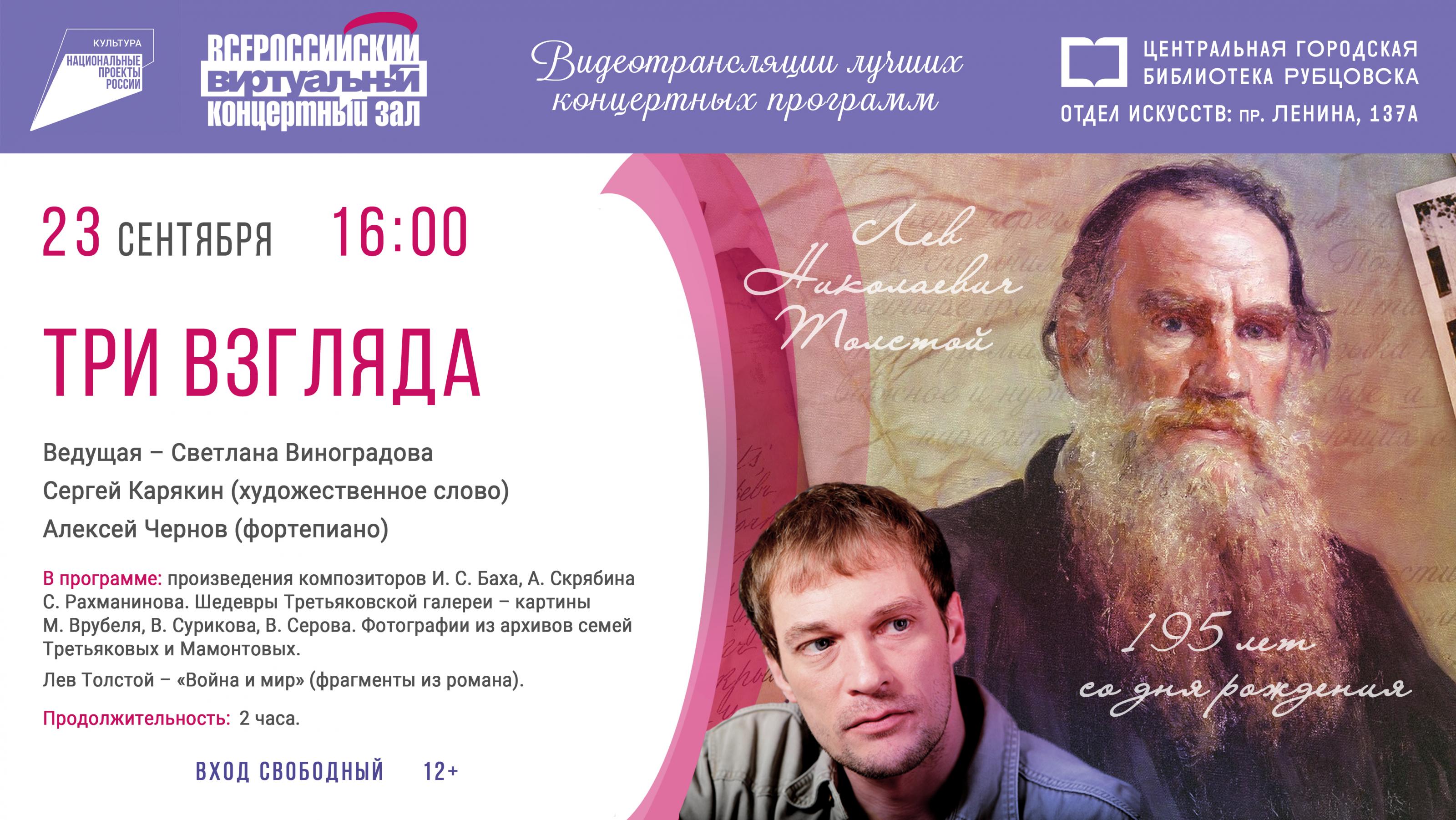 23 сентября в 16:00 в виртуальном концертном зале Центральной городской библиотеки состоится трансляция концерта «Три взгляда», посвящённая 195-летию со дня рождения Льва Толстого.