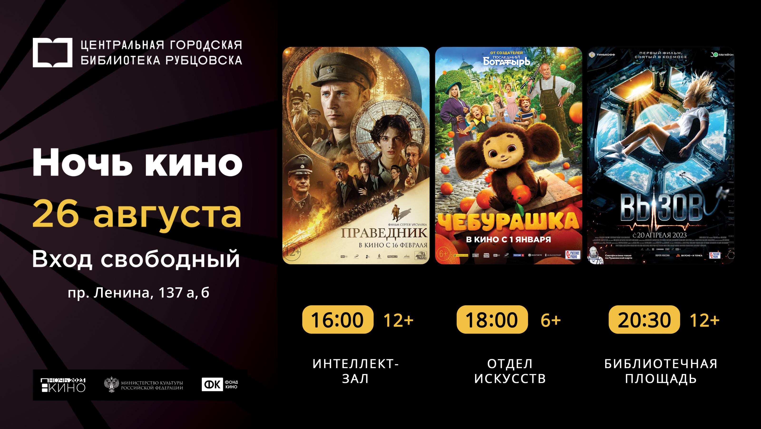 26 августа Центральная городская библиотека вновь присоединится к Всероссийской акции «Ночь кино». Ежегодная акция, которая пройдет в России в восьмой раз, приурочена ко Дню российского кино. «Ночь кино» – это возможность бесплатно посмотреть самые кассовые фильмы 2023 года.