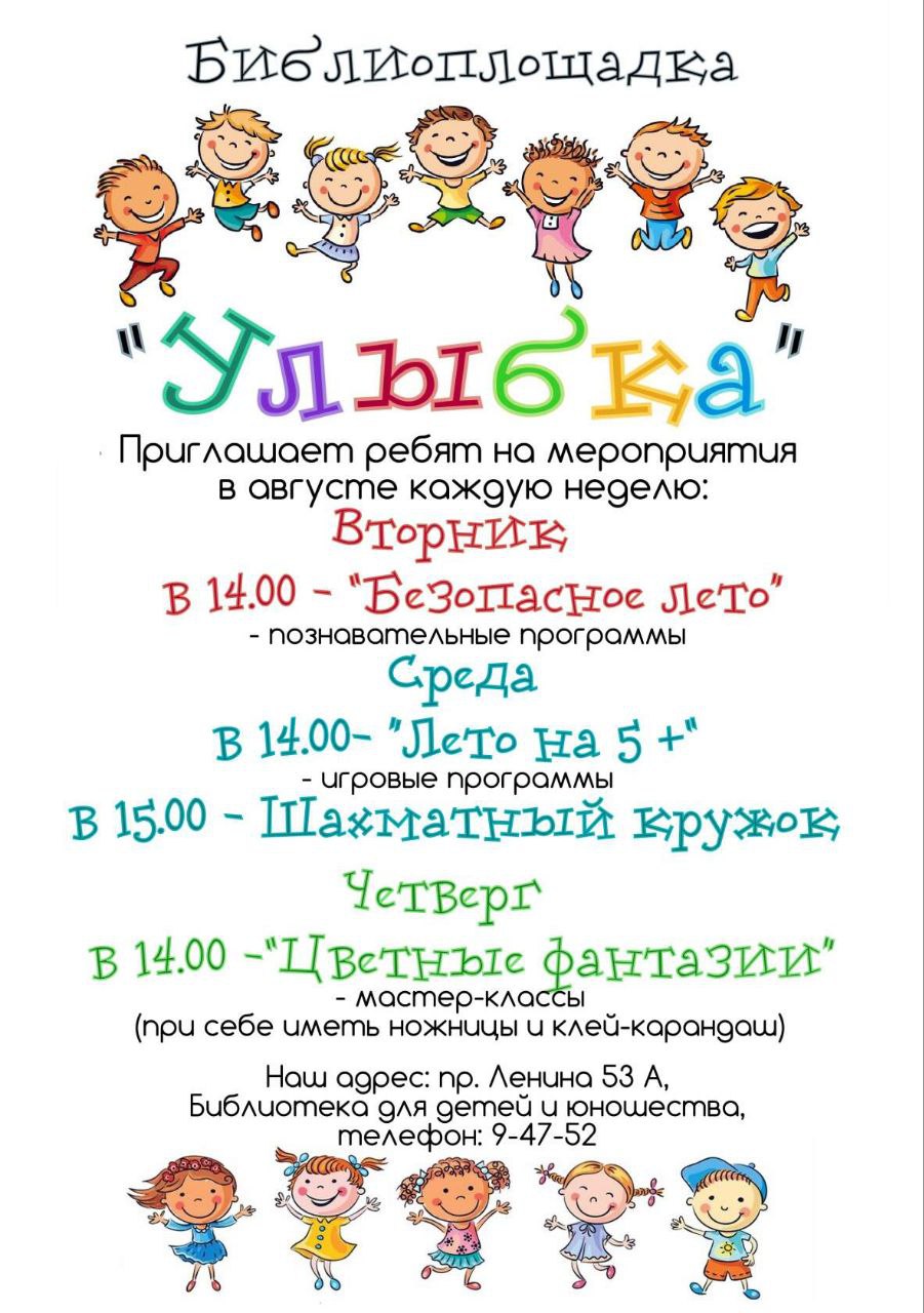 Библиоплощадка "Улыбка" приглашает юных рубцовчан в августе посетить мероприятия: