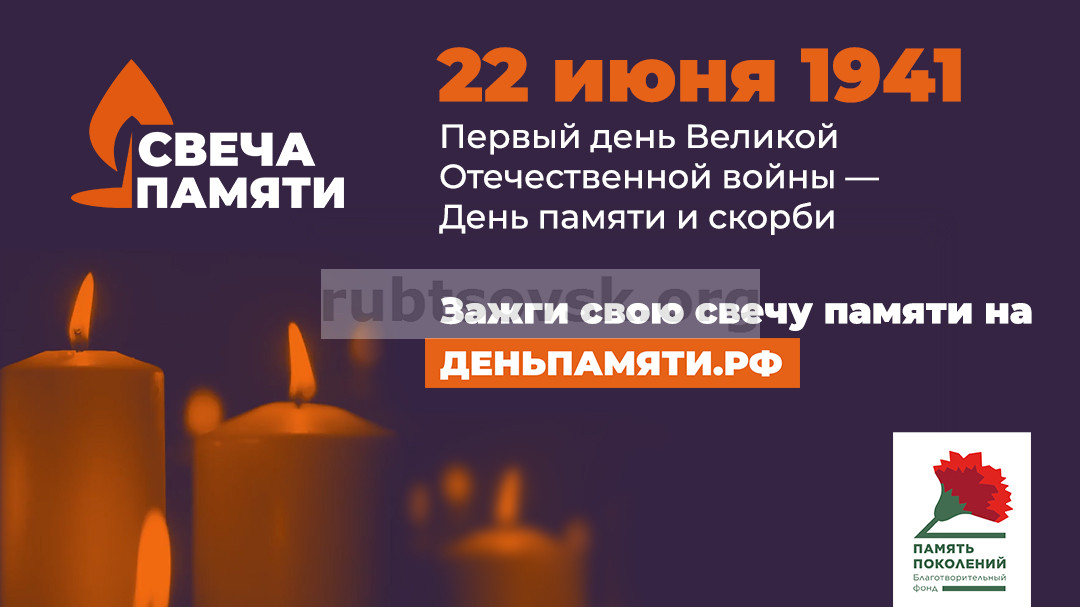Благотворительный фонд "ПАМЯТЬ ПОКОЛЕНИЙ" организует Всероссийскую онлайн-акцию "Свеча памяти", которая позволит большему количеству граждан присоединиться к Общенациональному Дню Памяти и скорби путем зажжения виртуальных свечей на сайте https://www.деньпамяти.рф/ в знак памяти о погибших. Принять участие в акции можно до 22 июня 2023.