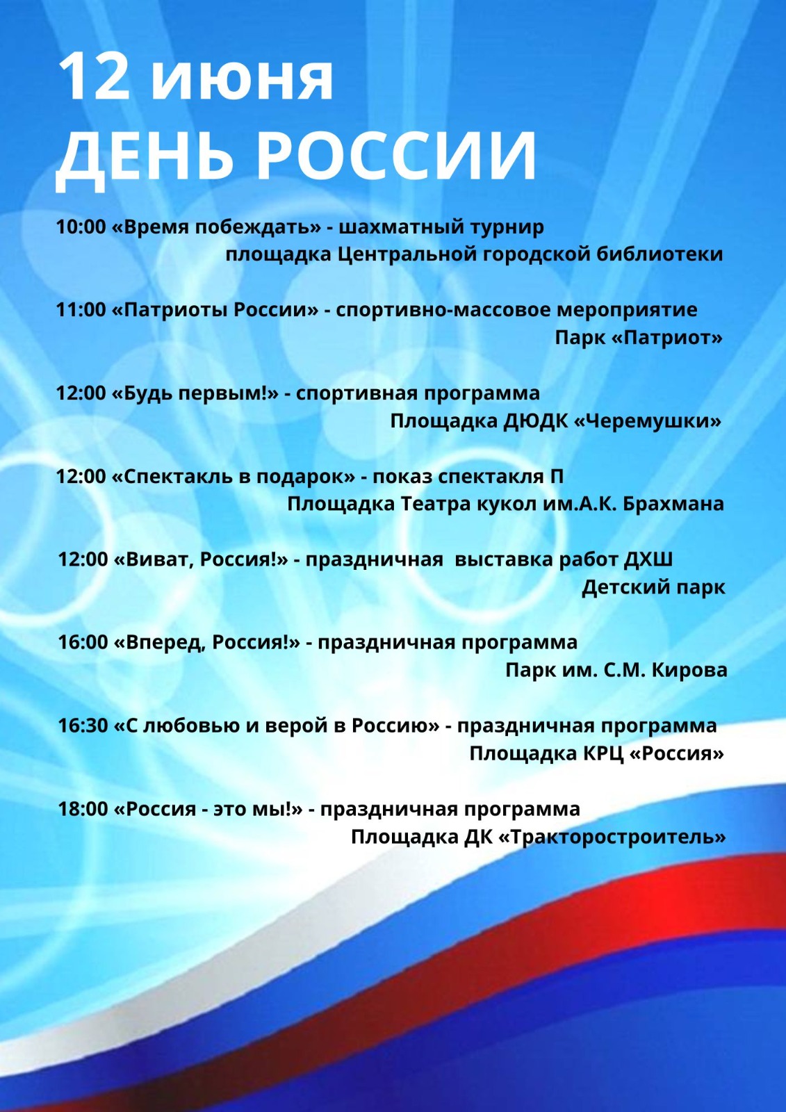 12:00 «Самый лучший летний день!» - праздничная концертно-игровая программа (0+) площадка «ДЮДК «Черемушки» 12:00 «Дайте детству наиграться» — праздничная программа (6+) Детская библиотека № 2