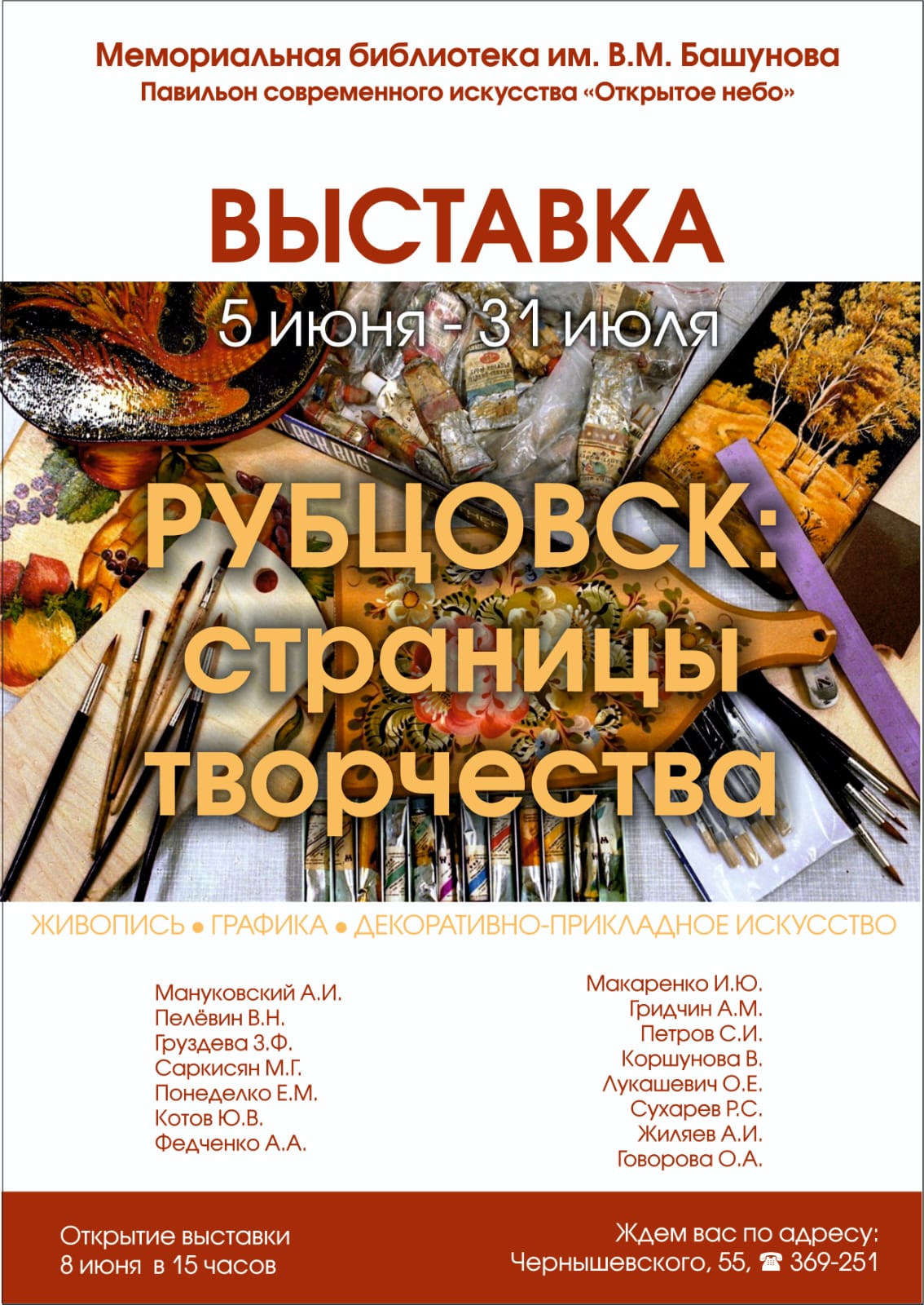 Картинная галерея им. В.В, Тихонова для этой экспозиции представила работы известных рубцовских авторов: А.И. Мануковский, В.Н. Пелёвин, З.Ф. Груздева, М.Г. Саркисян, Е.М. Понеделко, Ю.В. Котов, А.А. Федченко, И.Ю. Макаренко, А.М. Гридчин, С.И. Петров, В. Коршунова, О.Е. Лукашевич, Р.С. Сухарев, А.И. Жиляев, О.А. Говорова.