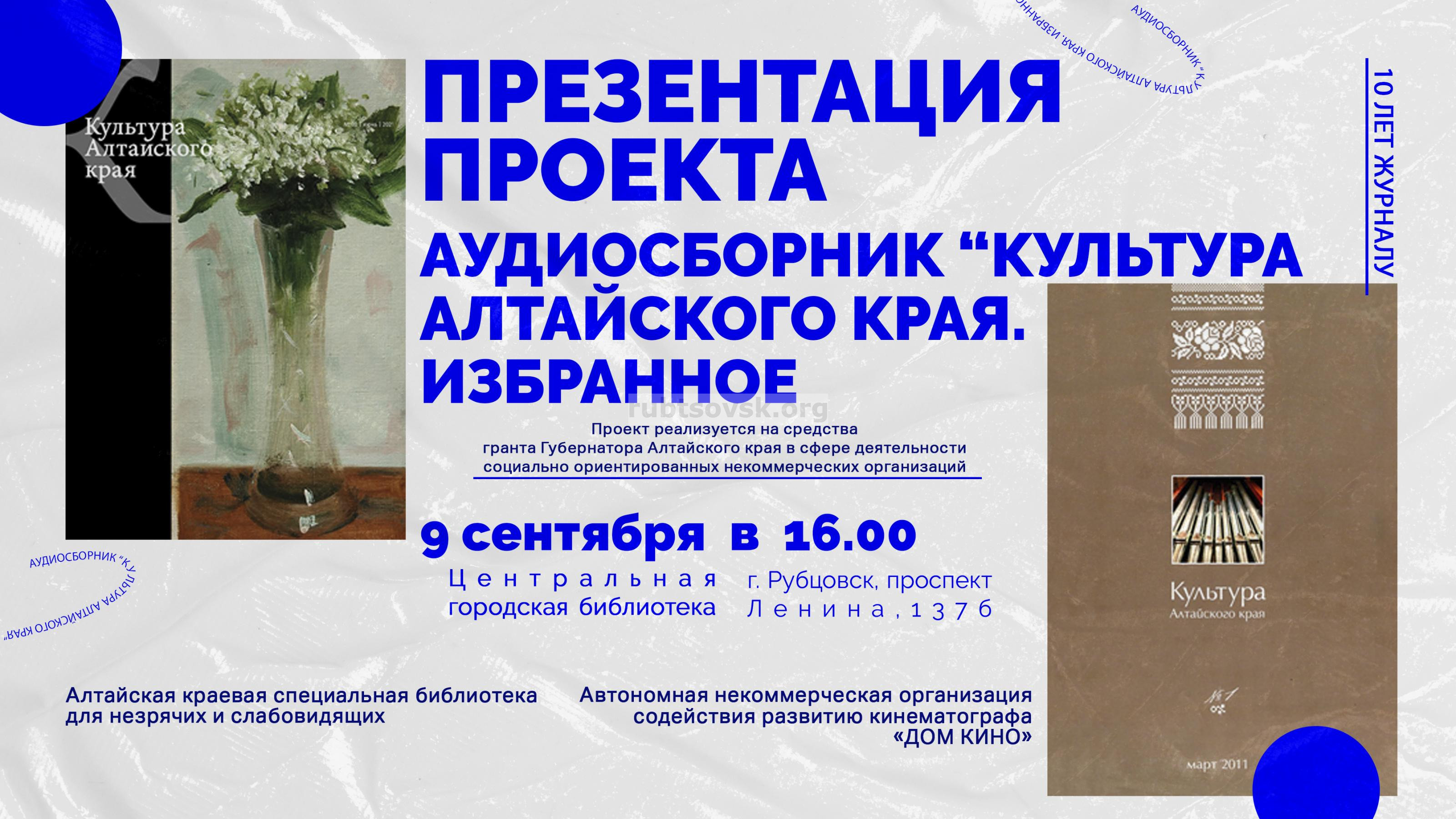 В 16 часов состоится презентация проекта «Аудиосборник «Культура Алтайского края. Избранное». Аудиосборник «Культура Алтайского края. Избранное» поможет слабовидящим и слепым жителям края получить доступ к источнику информации в сфере культуры и искусства, расширит читательскую аудиторию и позволит использовать материалы журнала в широком спектре культурных мероприятий.