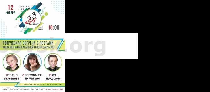12 ноября в 15 часов Центральная городская библиотека приглашает рубцовчан и гостей города на творческую встречу с алтайскими литераторами – поэтами, членами Союза писателей России Татьяной Кузнецовой, Александрой Малыгиной и Иваном Мордовиным.
