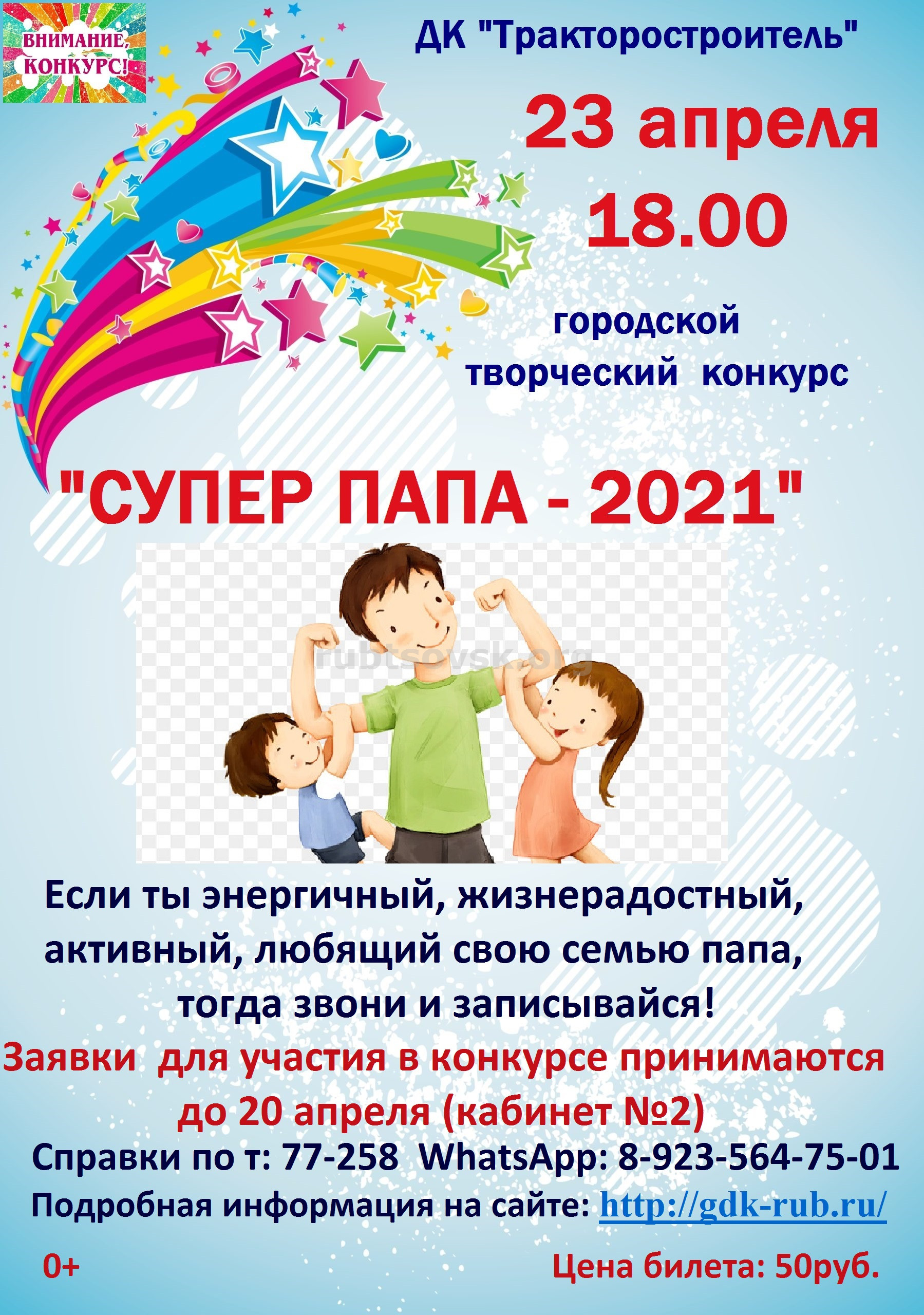 23 апреля в 18.00 во Дворце культуры «Тракторостроитель» состоится ХV городской конкурс отцов "Супер-папа-2021". Конкурс пользуется популярностью у жителей Рубцовска и неизменно дарит зрителям и участникам много ярких положительных эмоций.